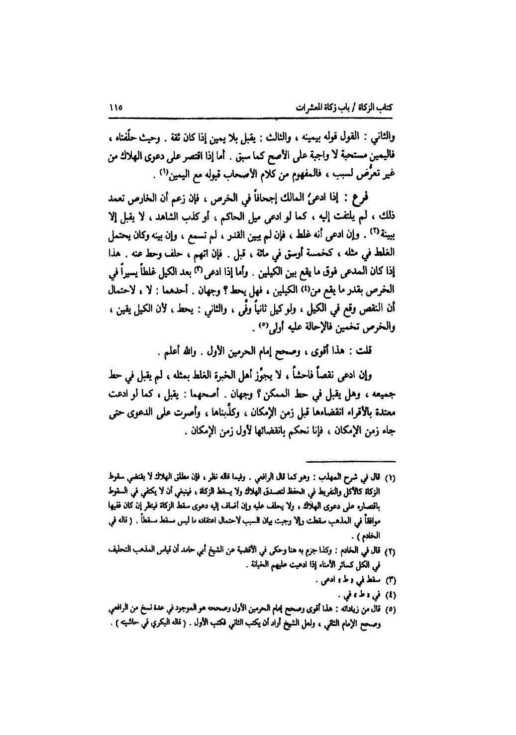 والثاني: القول قوله بيمينه، والثالث: يقبل بلا يمين إذا كان ثقة. وحيث حلفناه، فاليمين مستحبة لا واجبة على الاصح كما سبق. أما إذا اقتصر على دعوى الهلاك من غير تعرض لسبب، فالمفهوم من كلام الاصحاب قبوله مع اليمين. فرع إذا ادعى المالك إجحافا في الخرص، فإن زعم أن الخارص تعمد ذلك، لم يلتفت إليه، كما لو ادعى ميل الحاكم، أو كذب الشاهد، لا يقبل إلا ببينة. وإن ادعى أنه غلط، فإن لم يبين القدر، لم تسمع، وإن بينه وكان يحتمل الغلط في مثله، كخمسة أوسق في مائة، قبل. فإن اتهم، حلف وحط عنه. هذا إذا كان المدعى فوق ما يقع بين الكيلين. وأما إذا بعد الكيل غلطا يسيرا في الخرص بقدر ما يقع في الكيلين، فهل يحط ؟ وجهان. أحدهما: لا، لاحتمال أن النقص وقع في الكيل، ولو كيل ثانيا وفى، والثاني: يحط، لان الكيل يقين، والخرص تخمين فالاحالة عليه أولى. قلت: هذا أقوى، وصحح إمام الحرمين الاول. والله أعلم. وإن ادعى نقصا فاحشا، لا يجوز أهل الخبرة الغلط بمثله، لم يقبل في حط جميعه، وهل يقبل في حط الممكن ؟ وجهان. أصحهما: يقبل، كما لو ادعت معتدة بالاقراء انقضاءها قبل زمن الامكان، وكذبناها، وأصرت على الدعوى حتى جاء زمن الامكان، فإنا نحكم بانقضائها لاول زمن الامكان.