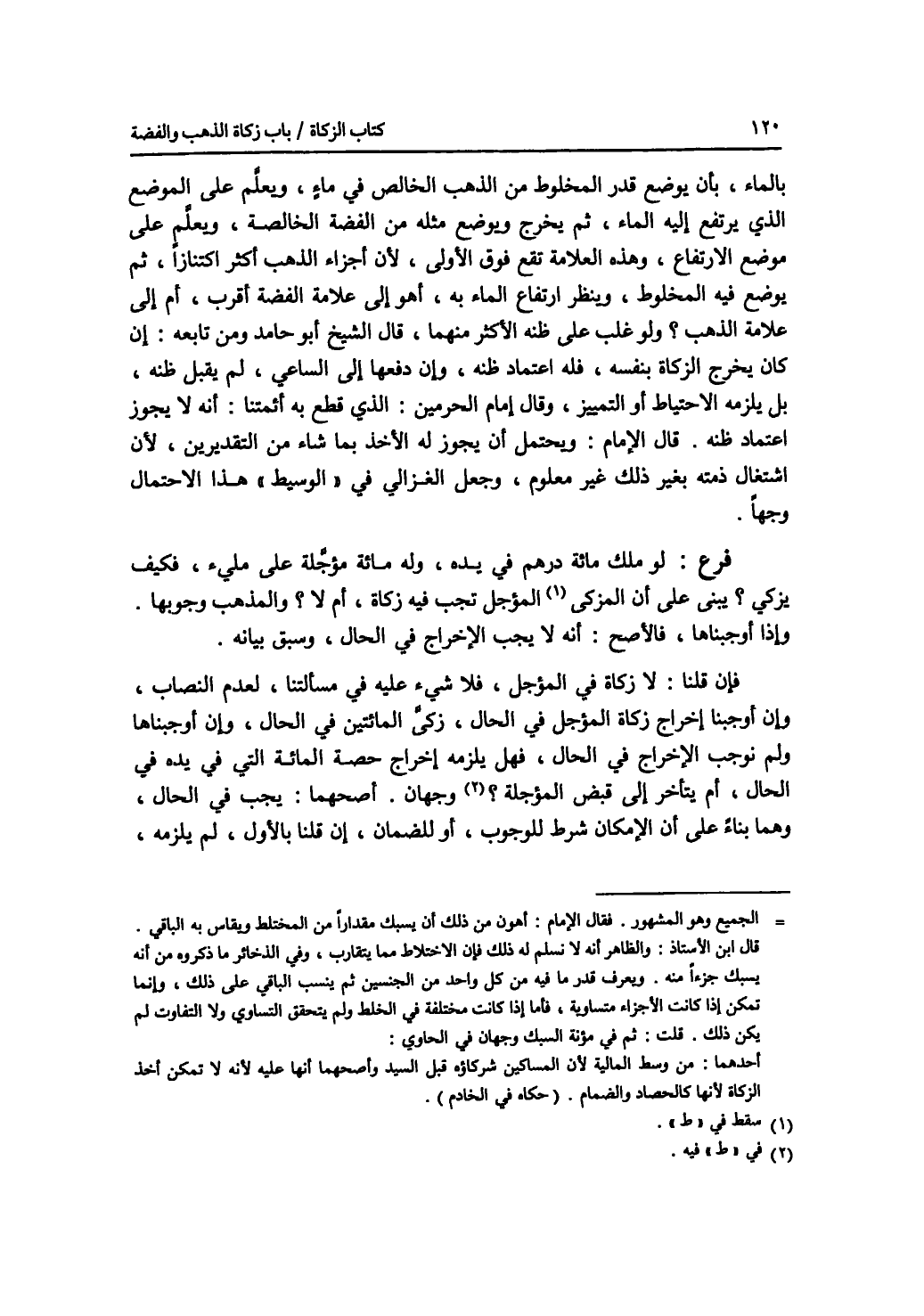 بالماء، بأن يوضع قدر المخلوط من الذهب الخالص في ماء، ويعلم على الموضع الذي يرتفع إليه الماء، ثم يخرج ويوضع مثله من الفضة الخالصة، ويعلم على موضع الارتفاع، وهذه العلامة تقع فوق الاولى، لان أجزاء الذهب أكثر اكتنازا، ثم يوضع فيه المخلوط، وينظر ارتفاع الماء به، أهو إلى علامة الفضة أقرب، أم إلى علامة الذهب ؟ ولو غلب على ظنه الاكثر منهما، قال الشيخ أبو حامد ومن تابعه: إن كان يخرج الزكاة بنفسه، فله اعتماد ظنه، وإن دفعها إلى الساعي، لم يقبل ظنه، بل يلزمه الاحتياط أو التمييز، وقال إمام الحرمين: الذي قطع به أئمتنا: أنه لا يجوز اعتماد ظنه. قال الامام: ويحتمل أن يجوز له الاخذ بما شاء من التقديرين، لان اشتغال ذمته بغير ذلك غير معلوم، وجعل الغزالي في الوسيط هذا الاحتمال وجها. فرع لو ملك مائة درهم في يده، وله مائة مؤجلة على ملئ، فكيف يزكي ؟ يبني على أن المؤجل تجب فيه زكاة، أم لا ؟ والمذهب وجوبها. وإذا أوجبناها، فالاصح: أنه لا يجب الاخراج في الحال، وسبق بيانه. فإن قلنا: لا زكاة في المؤجل، فلا شئ عليه في مسألتنا، لعدم النصاب. وإن أوجبنا إخراج زكاة المؤجل في الحال، زكى المائتين في الحال، وإن أوجبناها ولم نوجب الاخراج في الحال، فهل يلزمه إخراج حصة المائة التي في يده في الحال، أم يتأخر إلى قبض المؤجلة ؟ فيه وجهان. أصحهما: يجب في الحال، وهما بناء على أن الامكان شرط للوجوب، أو الضمان، إن قلنا بالاول، لم يلزمه،