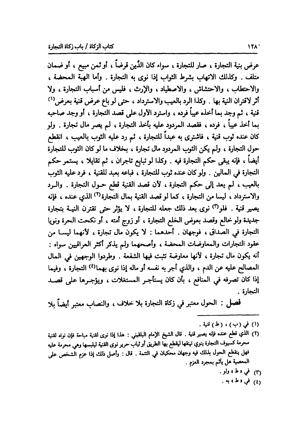 عرض بنية التجارة، صار للتجارة، سواء كان الدين قرضا، أو ثمن مبيع، أو ضمان متلف. وكذلك الاتهاب بشرط الثواب إذا نوى به التجارة. وأما الهبة المحضة، والاحتطاب، والاحتشاش، والاصطياد، والارث، فليس من أسباب التجارة، ولا أثر لاقتران النية بها. وكذا الرد بالعيب والاسترداد، حتى لو باع عرض قنية بعرض قنية، ثم وجد بما أخذه عيبا فرده، واسترد الاول على قصد التجارة، أو وجد صاحبه بما أخذ عيبا، فرده، فقصد المردود عليه بأخذ التجارة، لم يصر مال تجارة. ولو كان عنده ثوب قنية، فاشترى به عبدا للتجارة، ثم رد عليه الثوب بالعيب، انقطع حول التجارة، ولم يكن الثوب المردود مال تجارة، بخلاف ما لو كان الثوب للتجارة أيضا، فإنه يبقى حكم التجارة فيه. وكذا لو تبايع تاجران، ثم تقايلا، يستمر حكم التجارة في المالين. ولو كان عنده ثوب للتجارة، فباعه بعبد للقنية، فرد عليه الثوب بالعيب، لم يعد إلى حكم التجارة، لان قصد القنية قطع حول التجارة. والرد والاسترداد، ليسا من التجارة، كما لو قصد القنية بمال التجارة الذي عنده، فانه يصير قنية. ولو نوى بعد ذلك جعله للتجارة، لا يؤثر حبى تقترن النية بتجارة جديدة. ولو خالع وقصد بعوض الخلع التجارة، أو زوج أمته، أو نكحت الحرة ونويا التجارة في الصداق، فوجهان. أحدهما: لا يكون مال تجارة، لانهما ليسا من عقود التجارات والمعاوضات المحضة، وأصحهما ولم يذكر أكثر العراقيين سواه: أنه يكون مال تجارة، لانها معاوضة تثبت فيها الشفعة. وطردوا الوجهين في المال المصالح عليه عن الدم، والذي أجر به نفسه أو ماله إذا نوى به التجارة، وفيما إذا كان تصرفه في المنافع، بأن كان يستأجر المستغلات، ويؤجرها على قصد التجارة. فصل الحول معتبر في زكاة التجارة بلا خلاف، والنصاب معتبر أيضا بلا