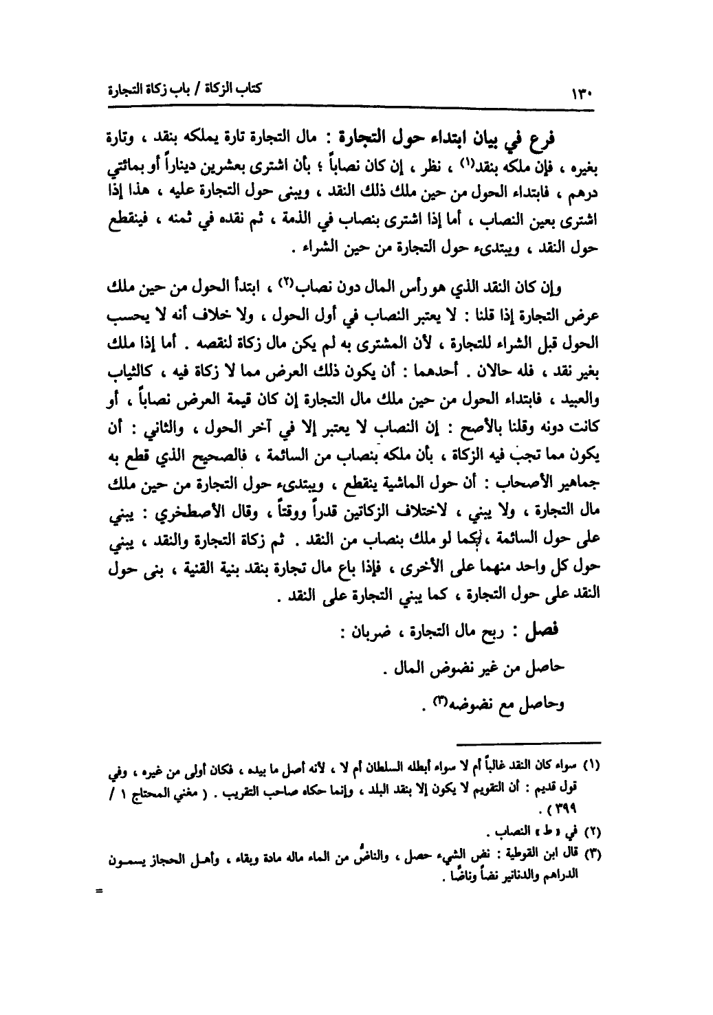 فرع في بيان ابتداء حول التجارة مال التجارة تارة يملكه بنقد، وتارة بغيره، فإن ملكه بنقد، نظر، إن كان نصابا بأن اشترى بعشرين دينارا أو بمائتي درهم، فابتداء الحول من حين ملك ذلك النقد، ويبنى حول التجارة عليه، هذا إذا اشترى بعين النصاب، أما إذا اشترى بنصاب في الذمة، ثم نقده في ثمنه، فينقطع حول النقد، ويبتدئ حول التجارة من حين الشراء، وإن كان النقد الذي هو رأس المال دون النصاب، ابتدأ الحول من حين ملك عرض التجارة إذا قلنا: لا يعتبر النصاب في أول الحول، ولا خلاف أنه لا يحسب الحول قبل الشراء للتجارة، لان المشترى به لم يكن مال زكاة لنقصه. أما إذا ملك بغير نقد، فله حالان. أحدهما: أن يكون ذلك العرض مما لا زكاة فيه، كالثياب والعبيد، فابتداء الحول من حين ملك مال التجارة إن كان قيمة العرض نصابا، أو كانت دونه وقلنا بالاصح: إن النصاب لا يعتبر إلا في آخر الحول، والثاني: أن يكون مما تجب فيه الزكاة، بأن ملكه بنصاب من السائمة، فالصحيح الذي قطع به جماهير الاصحاب: أن حول الماشية ينقطع، ويبتدئ حول التجارة من حين ملك مال التجارة، ولا يبني، لاختلاف الزكاتين قدرا ووقتا، وقال الاصطخري: يبنى على حول السائمة، كما لو ملك بنصاب من النقد. ثم زكاة التجارة والنقد، يبني حول كل واحد منهما على الاخرى، فإذا باع مال تجارة بنقد بنية القنية، بنى حول النقد على حول التجارة، كما يبني التجارة على النقد. فصل ربح مال التجارة، ضربان حاصل من غير نضوض المال، وحاصل مع نضوضه.