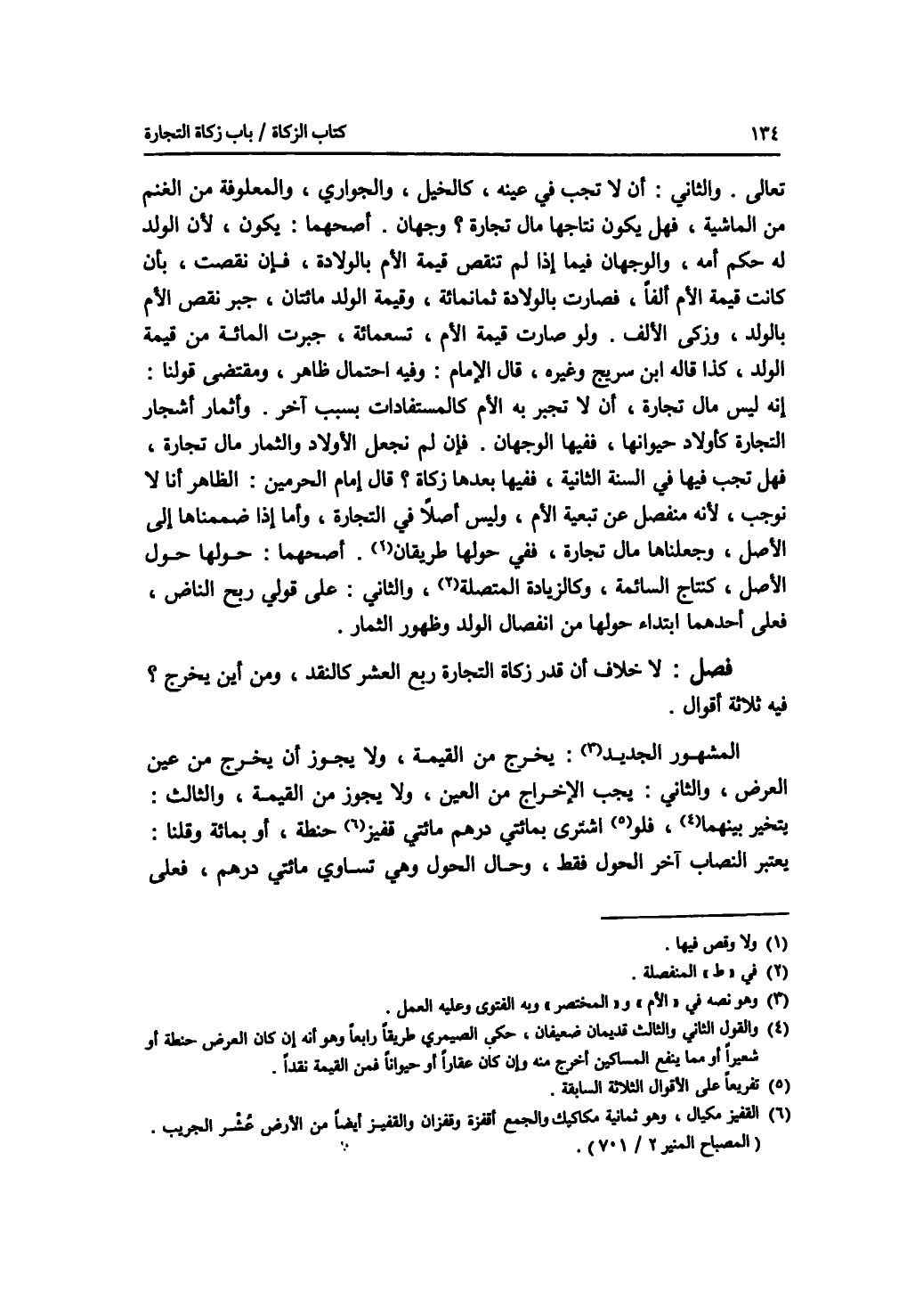 تعالى. والثاني: أن لا تجب في عينه، كالخيل، والجواري، والمعلوفة من النعم من الماشية، فهل يكون نتاجها مال تجارة ؟ وجهان. أصحهما: يكون، لان الولد له حكم أمه، والوجهان فيما إذا لم تنقص قيمة الام بالولادة، فإن نقصت، بأن كانت قيمة الام ألفا، فصارت بالولادة ثمانمائة، وقيمة الولد مائتان، جبر نقص الام بالولد، وزكى الالف. ولو صارت قيمة الام، تسعمائة، جبرت المائة من قيمة الولد، كذا قاله ابن سريج وغيره، قال الامام: وفيه احتمال ظاهر، ومقتضى قولنا: إنه ليس مال تجارة، أن لا تجبر به الام كالمستفادات بسبب آخر. وأثمار أشجار التجارة كأولاد حيوانها، ففيها الوجهان. فإن لم نجعل الاولاد والثمار مال تجارة، فهل تجب فيها في السنة الثانية، ففيها بعدها زكاة ؟ قال إمام الحرمين: الظاهر أنا لا نوجب، لانه منفصل عن تبعية الام، وليس أصلا في التجارة، وأما إذا ضممناها إلى الاصل، وجعلناها مال تجارة، ففي حولها طريقان. أصحهما: حولها حول الاصل، كنتاج السائمة، وكالزيادة المنفصلة، والثاني: على قولي ربح الناض، فعلى أحدهما ابتداء حولها من انفصال الولد وظهور الثمار. فصل لا خلاف أن قدر زكاة التجارة ربع العشر كالنقد، ومن أين يخرج ؟ فيه ثلاثة أقوال. المشهور الجديد: يخرج من القيمة، ولا يجوز أن يخرج من عين العرض، والثاني: يجب الاخراج من العين، ولا يجوز من القيمة، والثالث: يتخير بينهما، فلو اشترى بمائتي درهم مائتي قفقز حنطة، أو بمائة وقلنا: يعتبر النصاب آخر الحول فقط، وحال الحول وهي تساوي مائتي درهم، فعلى