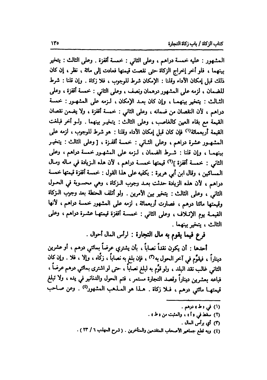 المشهور: عليه خمسة دراهم، وعلى الثاني: خمسة أقفزة وعلى الثالث: يتخير بينهما. فلو أخر إخراج الزكاة حتى نقصت قيمتها فعادت إلى مائة، نظر، إن كان ذلك قبل إمكان الاداء وقلنا: الامكان شرط للوجوب، فلا زكاة. وإن قلنا: شرط للضمان، لزمه على المشهور درهمان ونصف، وعلى الثاني: خمسة أقفزة، وعلى الثالث: يتخير بينهما، وإن كان بعد الامكان، لزمه على المشهور: خمسة دراهم، لان النقصان من ضمانه، وعلى الثاني: خمسة أقفزة، ولا يضمن نقصان القيمة مع بقاء العين كالغاصب، وعلى الثالث: يتخير بينهما. ولو أخر فبلغت القيمة أربعمائة درهم، فإن كان قبل إمكان الاداء وقلنا: هو شرط للوجوب، لزمه على المشهور عشرة دراهم، وعلى الثاني: خمسة أقفزة، وعلى الثالث: يتخير بينهما، وإن قلنا: شرط الضمان، لزمه على المشهور خمسة دراهم، وعلى الثاني: خمسة أقفزة قيمتها خمسة دراهم، لان هذه الزيادة في ماله ومال المساكين، وقال ابن أبي هريرة: يكفيه على هذا القول: خمسة أقفزة قيمتها خمسة دراهم، لان هذه الزيادة حدثت بعد وجوب الزكاة، وهي محسوبة في الحول الثاني، وعلى الثالث: يتخير بين الامرين. ولو أتلف الحنطة بعد وجوب الزكاة وقيمتها مائتا درهم، فصارت أربعمائة، لزمه على المشهور خمسة دراهم، لانها القيمة يوم الاتلاف، وعلى الثاني: خمسة أقفزة قيمتها عشرة دراهم، وعلى الثالث، يتخير بينهما. فرع فيما يقوم به مال التجارة لرأس المال أحوال. أحدها: أن يكون نقدا نصابا، بأن يشتري عرضا بمائتي درهم، أو عشرين دينارا، فيقوم في آخر الحول به، فإن بلغ به نصابا، زكاه، وإلا، فلا. وإن كان الثاني غالب نقد البلد، ولو قوم به لبلغ نصابا، حتى لو اشترى بمائتي درهم عرضا، فباعه بعشرين دينارا وقصد التجارة مستمر، فتم الحول والدنانير في يده، ولا تبلغ قيمتها مائتي درهم، فلا زكاة. هذا هو المذهب المشهور. وعن صاحب