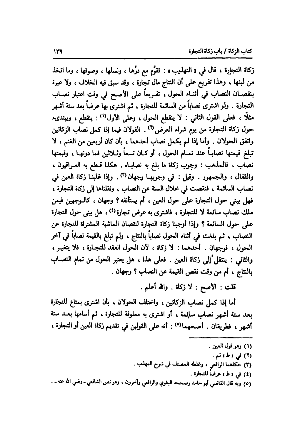 زكاة التجارة، قال في التهذيب: تقوم مع درها، ونسلها، وصوفها، وما اتخذ من لبنها، وهذا تفريع على أن النتاج مال تجارة، وقد سبق فيه الخلاف، ولا عبرة بنقصان النصاب في أثناء الحول، تفريعا على الاصح في وقت اعتبار نصاب التجارة. ولو اشترى نصابا من السائمة التجارة، ثم اشترى بها عرضا بعد ستة أشهر مثلا، فعلى القول الثاني: لا ينقطع الحول، وعلى الاول: ينقطع، ويبتدئ حول زكاة التجارة من يوم شراء العرض. ثم القولان فيما إذا كمل نصاب الزكاتين واتفق الحولان. وأما إذا لم يكمل نصاب أحدهما، بأن كان أربعين من الغنم، لا تبلغ قيمتها نصابا عند تمام الحول، أو كان تسعا وثلاثين فما دونها، وقيمتها نصاب، فالمذهب: وجوب زكاة ما بلغ به نصاباه. هكذا قطع به العراقيون، والقفال، والجمهور. وقيل: في وجوبها وجهان. وإذا غلبنا زكاة العين في نصاب السائمة، فنقصت في خلال السنة عن النصاب، ونقلناها إلى زكاة التجارة، فهل يبني حول التجارة على حول العين، أم يستأنفه ؟ وجهان، كالوجهين فيمن ملك نصاب سائمة لا للتجارة، فاشترى به عرضا للتجارة، هل يبنى حول التجارة على حول السائمة ؟ وإذا أوجبنا زكاة التجارة لنقصان الماشية المشتراة للتجارة عن النصاب، ثم بلغت في اثناء الحول نصابا بالنتاج، ولم تبلغ بالقيمة نصابا في آخر الحول، فوجهان. أحدهما: لا زكاة، لان الحول انعقد للتجارة، فلا يتغير، والثاني: ينتقل إلى زكاة العين. فعلى هذا، هل يعتبر الحول من تمام النصاب بالنتاج، أم من وقت نقص القيمة عن النصاب ؟ وجهان. قلت: الاصح: لا زكاة. والله أعلم. أما إذا كمل نصاب الزكاتين، واختلف الحولان، بأن اشترى بمتاع التجارة بعد ستة أشهر نصاب سائمة، أو اشترى به معلوفة للتجارة، ثم أسامها بعد ستة أشهر، فطريقان. أصحهما: أنه على القولين في تقديم زكاة العين أو التجارة،