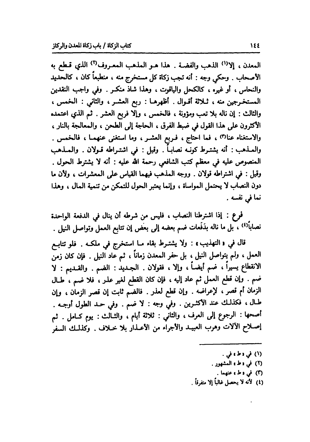 المعدن، إلا في الذهب والفضة. هذا هو المذهب المشهور الذي قطع به الاصحاب. وحكي وجه: أنه تجب زكاة كل مستخرج منه، منطبعا كان، كالحديد والنحاس، أو غيره، كالكحل والياقوت، وهذا شاذ منكر. وفي واجب النقدين المستخرجين منه، ثلاثة أقوال. أظهرها: ربع العشر، والثاني: الخمس، والثالث: إن ناله بلا تعب ومؤونة، فالخمس، وإلا فربع العشر. ثم الذي اعتمده الاكثرون على هذا القول في ضبط الفرق، الحاجة إلى الطحن، والمعالجة بالنار، والاستغناء عنهما، فما احتاج، فربع العشر، وما استغنى عنهما، فالخمس. والمذهب: أنه يشترط كونه نصابا. وقيل: في اشتراطه قولان. والمذهب المنصوص عليه في معظم كتب الشافعي رحمة الله عليه: أنه لا يشترط الحول. وقيل: في اشتراطه قولان. ووجه المذهب فيهما القياس على المعشرات، ولان ما دون النصاب لا يحتمل المواساة، وإنما يعتبر الحول للتمكن من تنمية المال، وهذا نما في نفسه. فرع إذا اشترطنا النصاب، فليس من شرطه أن ينال في الدفعة الواحدة نصابا، بل ما ناله بدفعات ضم بعضه إلى بعض إن تتابع العمل وتواصل النيل. قال في التهذيب: ولا يشترط بقاء ما استخرج في ملكه. فلو تتابع العمل، ولم يتواصل النيل، بل حفر المعدن زمانا، ثم عاد النيل، فان كان زمن الانقطاع يسيرا، ضم أيضا، وإلا، فقولان. الجديد: الضم. والقديم: لا ضم. وإن قطع العمل ثم عاد إليه، فإن كان القطع لغير عذر، فلا ضم، طال الزمان أم قصر، لاعراضه. وإن قطع لعذر، فالضم ثابت إن قصر الزمان، وإن طال، فكذلك عند الاكثرين. وفي وجه: لا ضم. وفي حد الطول أوجه. أصحها: الرجوع إلى العرف، والثاني: ثلاثة أيام، والثالث: يوم كامل. ثم إصلاح الآلات وهرب العبيد والاجراء من الاعذار بلا خلاف. وكذلك السفر