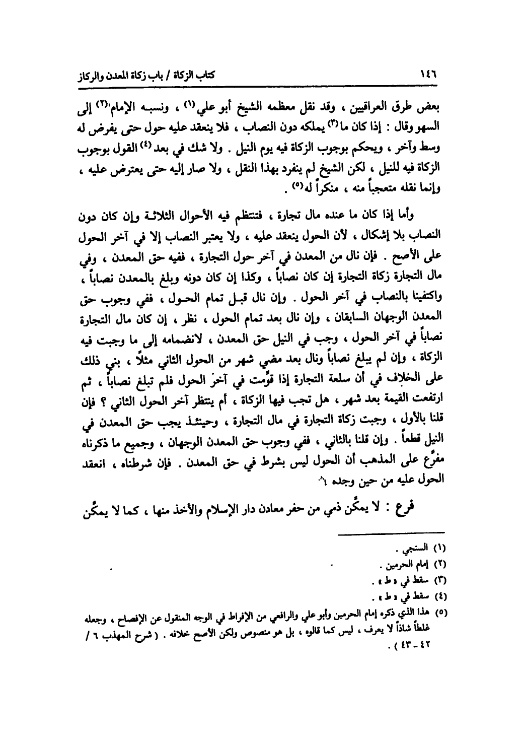 بعض طرق العراقيين، وقد نقل معظمه الشيخ أبو علي، ونسبه الامام إلى السهو وقال: إذا كان يملكه دون النصاب، فلا ينعقد عليه حول حتى يفرض له وسط وآخر، ويحكم بوجوب الزكاة فيه يوم النيل. ولا شك في القول بوجوب الزكاة فيه للنيل، لكن الشيخ لم ينفرد بهذا النقل، ولا صار إليه حتى يعترض عليه، وإنما نقله متعجبا منه، منكرا له. وأما إذا كان ما عنده مال تجارة، فتنتظم فيه الاحوال الثلاثة وإن كان دون النصاب بلا إشكال، لان الحول ينعقد عليه، ولا يعتبر النصاب إلا في آخر الحول على الاصح. فإن نال من المعدن في آخر حول التجارة، ففيه حق المعدن، وفي مال التجارة زكاة التجارة إن كان نصابا، وكذا إن كان دونه وبلغ بالمعدن نصابا، واكتفينا بالنصاب في آخر الحول. وإن نال قبل تمام الحول، ففي وجوب حق المعدن الوجهان السابقان، وإن نال بعد تمام الحول، نظر، إن كان مال التجارة نصابا في آخر الحول، وجب في النيل حق المعدن، لانضمامه إلى ما وجبت فيه الزكاة، وإن لم يبلغ نصابا ونال بعد مضي شهر من الحول الثاني مثلا، بني ذلك على الخلاف في أن سلعة التجارة إذا قومت في آخر الحول فلم تبلغ نصابا، ثم ارتفعت القيمة بعد شهر، هل تجب فيها الزكاة، أم ينتظر آخر الحول الثاني ؟ فإن قلنا بالاول، وجبت زكاة التجارة في مال التجارة، وحينئذ يجب حق المعدن في النيل قطعا. وإن قلنا بالثاني، ففي وجوب حق المعدن الوجهان، وجميع ما ذكرناه مفرع على المذهب أن الحول ليس بشرط في حق المعدن. فإن شرطناه، انعقد الحول عليه من حين وجده. فرع لا يمكن ذمي من حفر معادن دار الاسلام والاخذ منها، كما لا يمكن