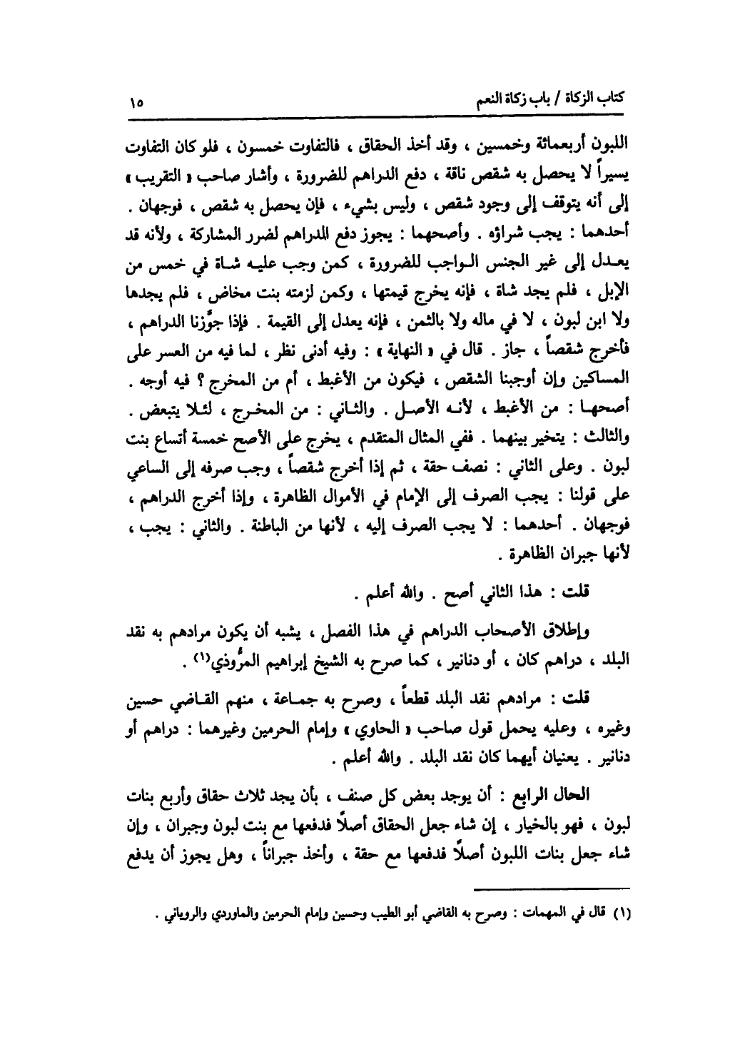 اللبون أربعمائة وخمسين، وقد أخذ الحقاق، فالتفاوت خمسون، فلو كان التفاوت يسيرا لا يحصل به شقص ناقة، دفع الدراهم للضرورة، وأشار صاحب التقريب إلى أنه يتوقف إلى وجود شقص، وليس بشئ، فإن يحصل به شقص، فوجهان. أحدهما: يجب شراؤه. وأصحهما: يجوز دفع الدراهم لضرر المشاركة، ولانه قد يعدل إلى غير الجنس الواجب للضرورة، كمن وجب عليه شاة في خمس من الابل، فلم يجد شاة، فإنه يخرج قيمتها، وكمن لزمته بنت مخاض، فلم يجدها ولا ابن لبون، لا في ماله ولا بالثمن، فإنه يعدل إلى القيمة. فإذا جوزنا الدراهم، فأخرج شقصا، جاز. قال في النهاية: وفيه أدنى نظر، لما فيه من العسر على المساكين وإن أوجبنا الشقص، فيكون من الاغبط، أم من المخرج ؟ فيه أوجه. أصحها: من الاغبط، لانه الاصل. والثاني: من المخرج، لئلا يتبعض. والثالث: يتخير بينهما. ففي المثال المتقدم، يخرج على الاصح خمسة أتساع بنت لبون. وعلى الثاني: نصف حقة، ثم إذا أخرج شقصا، وجب صرفه إلى الساعي على قولنا: يجب الصرف إلى الامام في الاموال الظاهرة، وإذا أخرج الدراهم، فوجهان. أحدهما: لا يجب الصرف إليه، لانها من الباطنة. والثاني: يجب، لانها جبران الظاهرة. قلت: هذا الثاني أصح. والله أعلم. وإطلاق الاصحاب الدراهم في هذا الفصل، يشبه أن يكون مرادهم به نقد البلد، دراهم كان، أو دنانير، كما صرح به الشيخ إبرهيم المروذي. قلت: مرادهم نقد البلد قطعا، وصرح به جماعة، منهم القاضي حسين وغيره، وعليه يحمل قول صاحب الحاوي وإمام الحرمين وغيرهما: دراهم أو دنانير، يعنيان أيهما كان نقد البلد. والله أعلم. الحال الرابع: أن يوجد بعض كل صنف، بأن يجد ثلاث حقاق وأربع بنات لبون، فهو بالخيار، إن شاء جعل الحقاق أصلا فدفعها مع بنت لبون وجبران، وإن شاء جعل بنات اللبون أصلا فدفعها مع حقة، وأخذ جبرانا، وهل يجوز أن يدفع