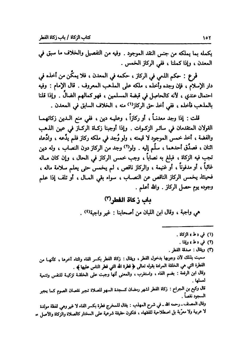 يكمله بما يملكه من جنس النقد الموجود. وفيه من التفصيل والخلاف ما سبق في المعدن، وإذا كملنا، ففي الركاز الخمس. فرع حكم الذمي في الركاز، حكمه في المعدن، فلا يمكن من أخذه في دار الاسلام، فإن وجده وأخذه، ملكه على المذهب المعروف. قال الحمام: وفيه احتمال عندي، لانه كالحاصل في قبضة المسلمين، فهو كما لهم الضال. وإذا قلنا بالمذهب فأخذه، ففي أخذ حق الزكاة منه، الخلاف السابق في المعدن. قلت: إذا وجد معدنا، أو ركازا، وعليه دين، ففي منع الدين زكاتهما القولان المتقدمان في سائر الزكوات. وإذا أوجبنا زكاة الركاز في عين الذهب والفضة، أخذ خمس الموجود لا قيمته، ولو وجد في ملكه ركاز فلم يدعه، وادعاه اثنان، فصدق أحدهما، سلم إليه. وإذا وجد من الركاز دون النصاب، وله دين تجب فيه الزكاة، فبلغ به نصابا، وجب خمس الركاز في الحال، وإن كان ماله غائبا، أو مدفونا، أو غنيمة، والركاز ناقص، لم يخمس، حتى يعلم سلامة ماله، فحينئذ يخمس الركاز الناقص عن النصاب، سواء بقي المال، أو تلف إذا علم وجوده يوم حصل الركاز. والله أعلم.