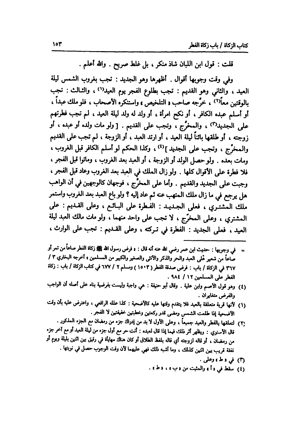 قلت: قول ابن اللبان شاذ منكر، بل غلط صريح. والله أعلم. وفي وقت وجوبها أقوال. أظهرها وهو الجديد: تجب بغروب الشمس ليلة العيد، والثاني: وهو القديم: تجب بطلوع الفجر يوم العيد، والثالث: تجب بالوقتين معا، خرجه صاحب التلخيص واستنكره الاصحاب، فلو ملك عبدا، أو أسلم عبده الكافر، أو نكح امرأة، أو ولد له ولد ليلة العيد، لم تجب فطرتهم على الجديد، وعلى المخرج، وتجب على القديم. ولو مات ولده أو عبده، أو زوجته، أو طلقها بائنا ليلة العيد، أو ارتد العبد، أو الزوجة، لم تجب على القديم والمخرج، وتجب على الجديد، وكذا الحكم لو أسلم الكافر قبل الغروب، ومات بعده. ولو حصل الولد أو الزوجة، أو العبد بعد الغروب، وماتوا قبل الفجر، فلا فطرة على الاقوال كلها. ولو زال الملك في العبد بعد الغروب وعاد قبل الفجر، وجبت على الجديد والقديم. وأما على المخرج، فوجهان كالوجهين في أن الواهب هل يرجع في ما زال ملك المتهب عنه ثم عاد إليه ؟ ولو باع العبد بعد الغروب واستمر ملك المشتري، فعلى الجديد: الفطرة على البائع، وعلى القديم: على المشتري، وعلى المخرج، لا تجب على واحد منهما، ولو مات مالك العبد ليلة العيد، فعلى الجديد: الفطرة في تركته، وعلى القديم: تجب على الوارث،
