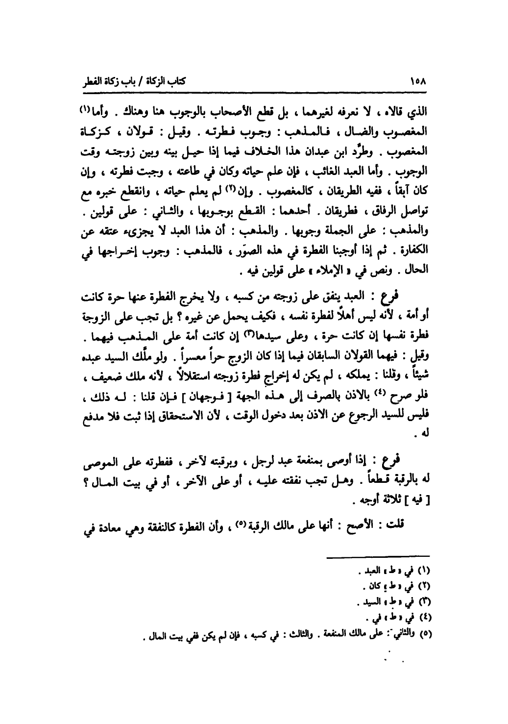 الذي قالاه، لا نعرفه لغيرهما، بل قطع الاصحاب بالوجوب هنا وهناك. وأما العبد المغصوب والضال، فالمذهب: وجوب فطرته. وقيل: قولان، كزكاة المغصوب. وطرد ابن عبدان هذا الخلاف فيما إذا حيل بينه وبين زوجته وقت الوجوب. وأما العبد الغائب، فان علم حياته وكان في طاعته، وجبت فطرته، وإن كان آبقا، ففيه الطريقان، كالمغصوب. وإن كان لم يعلم حياته، وانقطع خبره مع تواصل الرفاق، فطريقان. أحدهما: القطع بوجوبها، والثاني: على قولين. والمذهب: على الجملة وجوبها. والمذهب: أن هذا العبد لا يجزئ عتقه عن الكفارة. ثم إذا أوجبنا الفطرة في هذه الصور، فالمذهب: وجوب إخراجها في الحال. ونص في الاملاء على قولين فيه. فرع العبد ينفق على زوجته من كسبه، ولا يخرج الفطرة عنها حرة كانت أو أمة، لانه ليس أهلا لفطرة نفسه، فكيف يحمل عن غيره ؟ بل تجب على الزوجة فطرة نفسها إن كانت حرة، وعلى السيد إن كانت أمة على المذهب فيهما. وقيل: فيهما القولان السابقان فيما إذا كان الزوج حرا معسرا. ولو ملك السيد عبده شيئا، وقلنا: يملكه، لم يكن له إخراج فطرة زوجته استقلالا، لانه ملك ضعيف، فلو صرح في الاذن بالصرف إلى هذه الجهة (فوجهان) فإن قلنا: له ذلك، فليس للسيد الرجوع عن الاذن بعد دخول الوقت، لان الاستحقاق إذا ثبت فلا مدفع له. فرع إذا أوصى بمنفعة عبد لرجل، وبرقبته لآخر، ففطرته على الموصى له بالرقبة قطعا. وهل تجب نفقته عليه، أم على الآخر، أو في بيت المال ؟ (فيه) ثلاثة أوجه. قلت: الاصح: أنها على مالك الرقبة، وأن الفطرة كالنفقة وهي معادة في