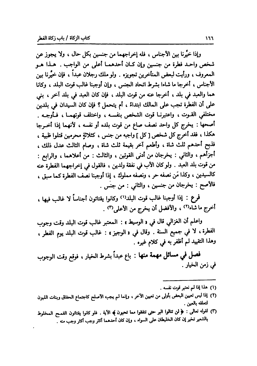 وإذا خيرنا بين الاجناس، فله إخراجهما من جنسين بكل حال، ولا يجوز عن شخص واحد فطرة من جنسين وإن كان أحدهما أعلى من الواجب. هذا هو المعروف، ورأيت لبعض المتأخرين تجويزه. ولو ملك رجلان عبدا، فإن خيرنا بين الاجناس، أخرجا ما شاءا بشرط اتحاد الجنس، وإن أوجبنا غالب قوت البلد، وكانا هما والعبد في بلد، أخرجا عنه من قوت البلد، فإن كان العبد في بلد آخر، بني على أن الفطرة تجب على المالك ابتداء، أم يتحمل ؟ فإن كان السيدان في بلدين مختلفي القوت، واعتبرنا قوت الشخص بنفسه، واختلف قوتهما، فأوجه. أصحها: يخرج كل واحد نصف صاع من قوت بلده أو نفسه، لانهما إذا أخرجا هكذا، فقد أخرج كل شخص (كل) واجبه من جنس، كثلاثة محرمين قتلوا ظبية، فذبح أحدهم ثلث شاة، وأطعم آخر بقيمة ثلث شاة، وصام الثالث عدل ذلك، أجزأهم، والثاني: يخرجان من أدنى القوتين، والثالث: من أعلاهما، والرابع: من قوت بلد العبد. ولو كان الاب في نفقة ولدين، فالقول في إخراجهما الفطرة عنه كالسيدين، وكذا من نصفه حر، ونصفه مملوك، إذا أوجبنا نصف الفطرة كما سبق، فالاصح: يخرجان من جنسين، والثاني: من جنس. فرع إذا أوجبنا غالب قوت البلد وكانوا يقتاتون أجناسا لا غالب فيها، أخرج ما شاء، والافضل أن يخرج من الاعلى. واعلم أن الغزالي قال في الوسيط: المعتبر غالب قوت البلد وقت وجوب الفطرة، لا في جميع السنة. وقال في الوجيز: غالب قوت البلد يوم الفطر، وهذا التقييد لم أظفر به في كلام غيره. فصل في مسائل مهمة منها: باع عبدا بشرط الخيار، فوقع وقت الوجوب في زمن الخيار،