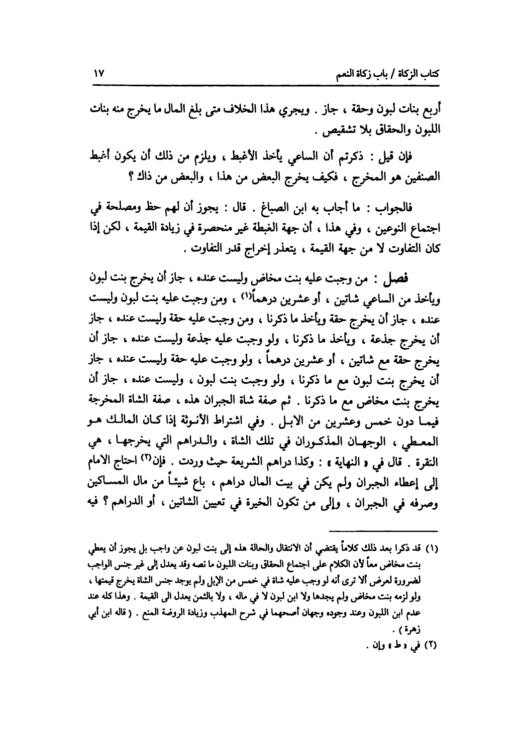 أربع بنات لبون وحقة، جاز. ويجري هذا الخلاف متى بلغ المال ما يخرج منه بنات اللبون والحقاق بلا تشقيص. فإن قيل: ذكرتم أن الساعي يأخذ الاغبط، ويلزم من ذلك أن يكون أغبط الصنفين هو المخرج، فكيف يخرج البعض من هذا، والبعض من ذاك ؟ فالجواب، ما أجاب به ابن الصباغ. قال: يجوز أن لهم حظ ومصلحة في اجتماع النوعين، وفي هذا، أن جهة الغبطة غير منحصرة في زيادة القيمة، لكن إذا كان التفاوت لا من جهة القيمة، يتعذر إخراج قدر التفاوت. فصل من وجبت عليه بنت مخاض وليست عنده، جاز أن يخرج بنت لبون ويأخذ من الساعي شاتين، أو عشرين درهما، ومن وجبت عليه بنت لبون وليست عنده، جاز أن يخرج حقة ويأخذ ما ذكرنا، ومن وجبت عليه حقة وليست عنده، جاز أن يخرج جذعة، ويأخذ ما ذكرنا، ولو وجبت عليه جذعة وليست عنده، جاز أن يخرج حقة مع شاتين، أو عشرين درهما، ولو وجبت عليه حقة وليست عنده جاز أن يخرج بنت لبون مع ما ذكرنا، ولو وجبت بنت لبون، وليست عنده، جاز أن يخرج بنت مخاض مع ما ذكرنا. ثم صفة شاة الجبران هذه، صفة الشاة المخرجة فيما دون خمس وعشرين من الابل. وفي اشتراط الانوثة إذا كان المالك هو المعطي، الوجهان المذكوران في تلك الشاة، والدراهم التي يخرجها، هي النقرة. قال في النهاية: وكذا دراهم الشريعة حيث وردت. وإن احتاج الامام إلى إعطاء الجبران ولم يكن في بيت المال دراهم، باع شيئا من مال المساكين وصرفه في الجبران، وإلى من تكون الخيرة في تعيين الشاتين، أو الدراهم ؟ فيه