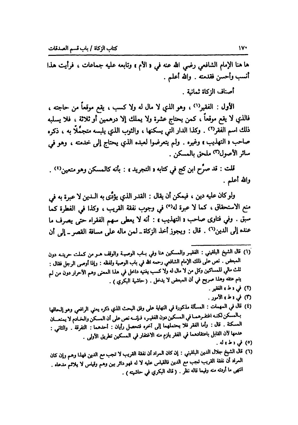 ها هنا الامام الشافعي رضي الله عنه في الام وتابعه عليه جماعات، فرأيت هذا أنسب وأحسن فقدمته. والله أعلم. أصناف الزكاة ثمانية. الاول: الفقير، وهو الذي لا مال له ولا كسب، يقع موقعا من حاجته، فالذي لا يقع موقعا، كمن يحتاج عشرة ولا يملك إلا درهمين أو ثلاثة، فلا يسلبه ذلك اسم الفقير. وكذا الدار التي يسكنها، والثوب الذي يلبسه متجملا به، ذكره صاحب التهذيب وغيره. ولم يتعرضوا لعبده الذي يحتاج إلى خدمته، وهو في سائر الامور ملحق بالمسكن. قلت: قد صرح ابن كج في كتابه التجريد: بأنه كالمسكن وهو متعين. والله أعلم. ولو كان عليه دين، فيمكن أن يقال: القدر الذي يؤدى به الدين لا عبرة به في منع الاستحقاق، كما لا عبرة له في وجوب نفقة القريب، وكذا في الفطرة كما سبق. وفي فتاوى صاحب التهذيب: أنه لا يعطى سهم الفقراء حتى يصرف ما عنده إلى الدين. قال: ويجوز أخذ الزكاة - لمن ماله على مسافة القصر - إلى أن