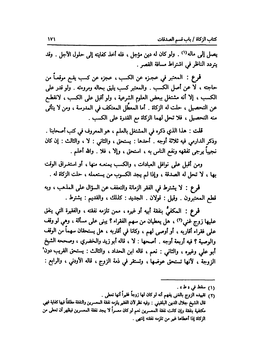 يصل إلى ماله. ولو كان له دين مؤجل، فله أخذ كفايته إلى حلول الاجل. وقد يتردد الناظر في اشتراط مسافة القصر. فرع المعتبر في عجزه عن الكسب، عجزه عن كسب يقع موقعا من حاجته، لا عن أصل الكسب. والمعتبر كسب يليق بحاله ومروءته. ولو قدر على الكسب، إلا أنه مشتغل ببعض العلوم الشرعية، ولو أقبل على الكسب، لانقطع عن التحصيل، حلت له الزكاة. أما المعطل المعتكف في المدرسة، ومن لا يتأتى منه التحصيل، فلا تحل لهما الزكاة مع القدرة على الكسب. قلت: هذا الذي ذكره في المشتغل بالعلم، هو المعروف في كتب أصحابنا. وذكر الدارمي فيه ثلاثة أوجه. أحدها: يستحق، والثاني: لا، والثالث: إن كان نجيبا يرجى تفقهه ونفع الناس به، استحق، وإلا، فلا. والله أعلم. ومن أقبل على نوافل العبادات، والكسب يمنعه منها، أو استغراق الوقت بها، لا تحل له الصدقة، وإذا لم يجد الكسوب من يستعمله، حلت الزكاة له. فرع لا يشترط في الفقر الزمانة والتعفف عن السؤال على المذهب، وبه قطع المعتبرون. وقيل: قولان. الجديد: كذلك، والقديم: يشترط. فرع المكفي بنفقة أبيه أو غيره، ممن تلزمه نفقته، والفقيرة التي ينفق عليها زوج غني، هل يعطيان من سهم الفقراء ؟ يبنى على مسألة، وهي لو وقف على فقراء أقاربه، أو أوصى لهم، وكانا في أقاربه، هل يستحقان سهما من الوقف والوصية ؟ فيه أربعة أوجه. أصحها: لا، قاله أبو زيد والخضري، وصححه الشيخ أبو علي وغيره، والثاني: نعم، قاله ابن الحداد، والثالث: يستحق القريب دون الزوجة، لانها تستحق عوضها، وتستقر في ذمة الزوج، قاله الاودني، والرابع: