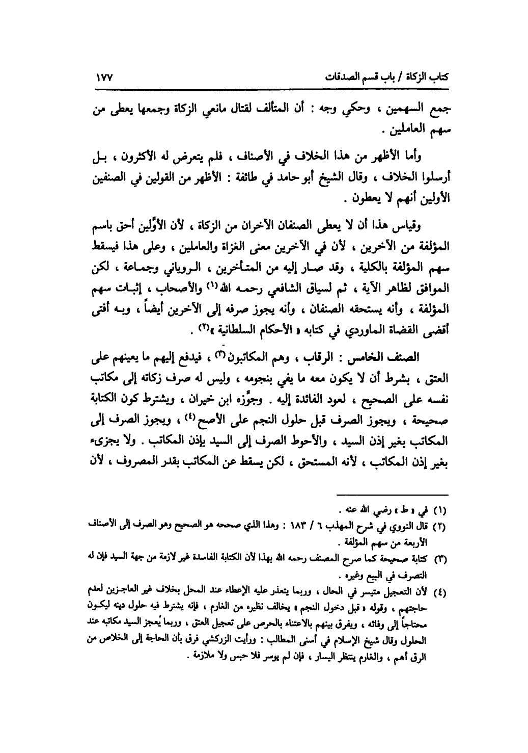 جمع السهمين، وحكي وجه: أن المتألف لقتال مانعي الزكاة وجمعها يعطى من سهم العاملين. وأما الاظهر من هذا الخلاف في الاصناف، لم يتعرض له الاكثرون، بل أرسلوا الخلاف، وقال الشيخ أبو حامد في طائفة: الاظهر من القولين في الصنفين الاولين أنهم لا يعطون، وقياس هذا أن لا يعطى الصنفان الآخران من الزكاة، لان الاولين أحق باسم المؤلفة من الآخرين، لان في الآخرين معنى الغزاة والعاملين، وعلى هذا فيسقط سهم المؤلفة بالكلية، وقد صار إليه من المتأخرين، الروياني وجماعة، لكن الموافق لظاهر الآية، ثم لسياق الشافعي رضي الله عنه والاصحاب، إثبات سهم المؤلفة، وأن يستحقه الصنفان، وأنه يجوز صرفه إلى الآخرين أيضا، وبه أفتى أقضى القضاة الماوردي في كتابه الاحكام السلطانية. الصنف الخامس: الرقاب، وهم المكاتبون، فيدفع إليهم ما يعينهم على العتق، بشرط أن لا يكون معه ما يفي بنجومه، وليس له صرف زكاته إلى مكاتب نفسه على الصحيح، لعود الفائدة إليه. وجوزه ابن خيران، ويشترط كون الكتابة صحيحة، ويجوز الصرف قبل حلول النجم على الاصح، ويجوز الصرف إلى المكاتب بغير إذن السيد، والاحوط الصرف إلى السيد بإذن المكاتب. ولا يجزئ بغير إذن المكاتب، لانه المستحق، لكن يسقط عن المكاتب بقدر المصروف، لان