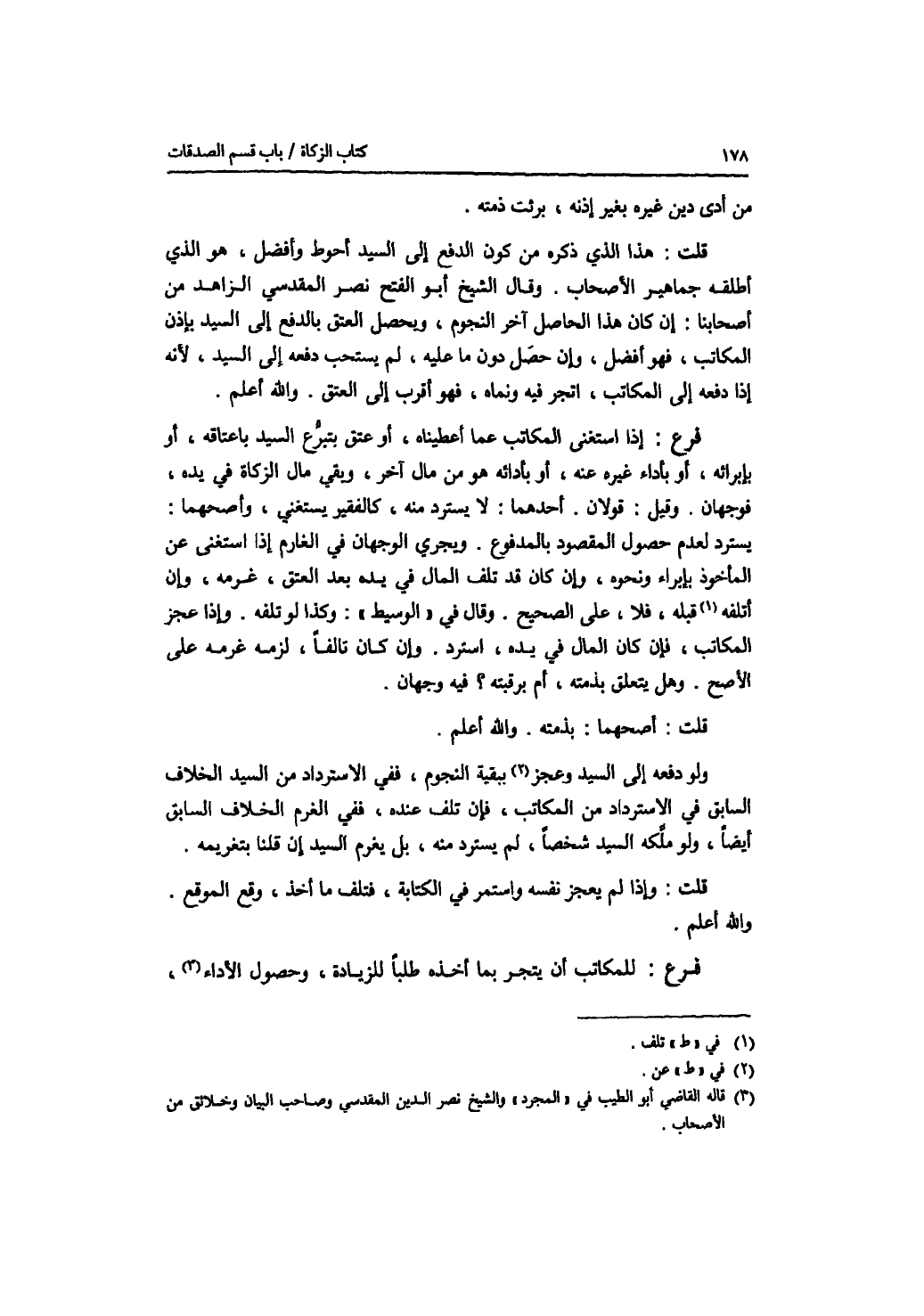 من أدى دين غيره بغير إذنه، برئت ذمته. قلت: هذا الذي ذكره من كون الدفع إلى السيد أحوط وأفضل، هو الذي أطلقه جماهير الاصحاب. وقال الشيخ أبو الفتح نصر المقدسي الزاهد من أصحابنا: إن كان هذا الحاصل آخر النجوم، ويحصل العتق بالدفع إلى السيد بإذن المكاتب، فهو أفضل، وإن حصل دون ما عليه، لم يستحب دفعه إلى السيد، لانه إذا دفعه إلى المكاتب، أتجر فيه ونماه، فهو أقرب إلى العتق. والله أعلم. فرع إذا استغنى المكاتب عما أعطيناه، أو عتق بتبرع السيد باعتاقه، أو بابرائه، أو بأداء غيره عنه، أو بأدائه هو من مال آخر، وبقي مال الزكاة في يده، فوجهان. وقيل: قولان. أحدهما: لا يسترد منه، كالفقير يستغني، وأصحهما: يسترد لعدم حصول المقصود بالمدفوع. ويجري الوجهان في الغارم إذا استغنى عن المأخوذ بإبراء ونحوه، وإن كان قد تلف المال في يده بعد العتق، غرمه، وإن أتلفه قبله، فلا، على الصحيح. وقال في الوسيط: وكذا لو تلفه. وإذا عجز المكاتب، فان كان المال في يده، استرد. وإن كان تالفا، لزمه غرمه على الاصح. وهل يتعلق بذمته، أم برقبته ؟ فيه وجهان. قلت: أصحهما: بذمته. والله أعلم. ولو دفعه إلى السيد وعجز عن بقية النجوم، ففي الاسترداد من السيد الخلاف السابق في الاسترداد من المكاتب، فان تلف عنده، ففي الغرم الخلاف السابق أيضا، ولو ملكه السيد شخصا، لم يسترد منه، بل يغرم السيد إن قلنا بتغريمه. قلت: وإذا لم يعجز نفسه واستمر في الكتابة، فتلف ما أخذ، وقع الموقع. والله أعلم. فرع للمكاتب أن يتجر بما أخذه طلبا للزيادة، وحصول الاداء،