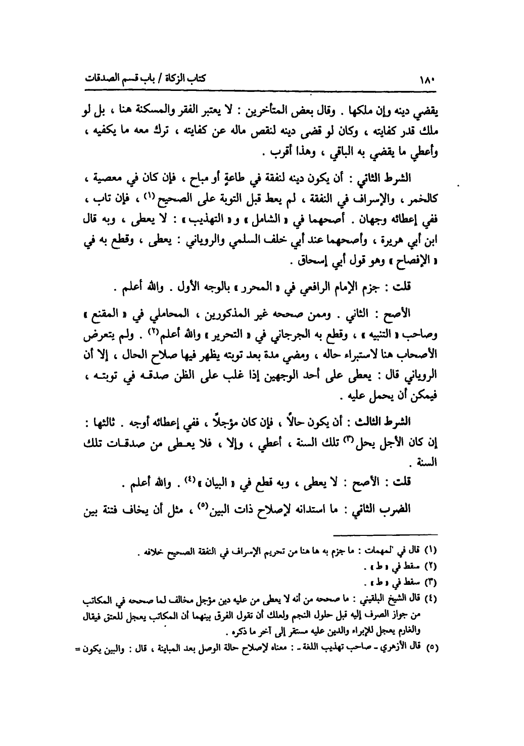 يقضى دينه وإن ملكها. وقال بعض المتأخرين: لا يعتبر الفقر والمسكنة هنا، بل لو ملك قدر كفايته، وكان لو قضى دينه لنقص ماله عن كفايته، ترك معه ما يكفيه، وأعطي ما يقضي به الباقي، وهذا أقرب. الشرط الثاني: أن يكون دينه لنفقة في طاعة أو مباح، فإن كان في معصية، كالخمر، والاسراف في النفقة، لم يعط قبل التوبة على الصحيح، فإن تاب، ففي إعطائه وجهان. أصحهما في الشامل والتهذيب: لا يعطى، وبه قال ابن أبي هريرة. وأصحهما عند أبي خلف السلمي والروياني: يعطى، وقطع به في الافصاح وهو قول أبي إسحق. قلت: جزم الامام الرافعي في المحرر بالوجه الاول. والله أعلم. الاصح: الثاني. وممن صححه غير المذكورين، المحاملي في المقنع وصاحب التنبيه، وقطع به الجرجاني في التحرير ولم يتعرض الاصحاب هنا لاستبراء حاله، ومضي مدة بعد توبته يظهر فيها صلاح الحال، إلا أن الروياني قال: يعطى على أحد الوجهين إذا غلب على الظن صدقه في توبته، فيمكن أن يحمل عليه. الشرط الثالث: أن يكون حالا، فإن كان مؤجلا، ففي إعطائه أوجه. ثالثها: إن كان الاجل تلك السنة، أعطي، وإلا، فلا يعطى من صدقات تلك السنة. قلت: الاصح: لا يعطى، وبه قطع في البيان. والله أعلم. الضرب الثاني: ما استدانه لاصلاح ذات البين، مثل أن يخاف فتنة بين