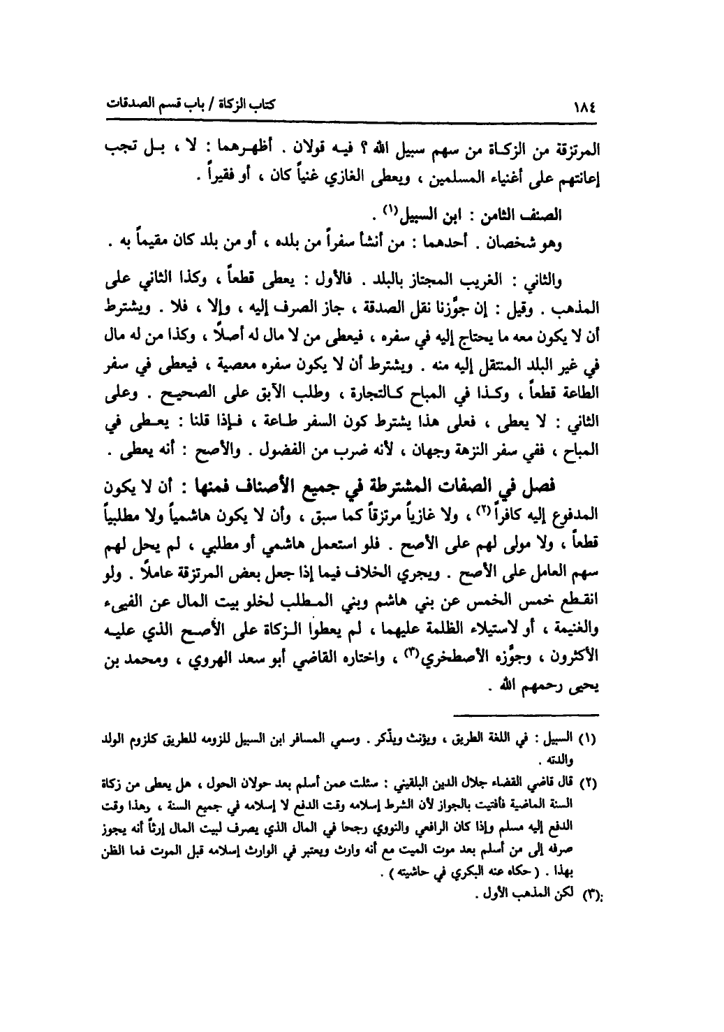 المرتزقة من الزكاة من سهم سبيل الله ؟ فيه قولان. أظهرهما: لا، بل تجب إعانتهم على أغنياء المسلمين، ويعطى الغازي غنيا كان، أو فقيرا. الصنف الثامن: ابن السبيل، وهو شخصان. أحدهما: من أنشأ سفرا من بلده، أو من بلد كان مقيما به. والثاني: الغريب المجتاز بالبلد. فالاول: يعطى قطعا، وكذا الثاني على المذهب. وقيل: إن جوزنا نقل الصدقة، جاز الصرف إليه، وإلا، فلا. ويشترط أن لا يكون معه ما يحتاج إليه في سفره، فيعطى من لا مال له أصلا، وكذا من له مال في غير البلد المنتقل إليه منه. ويشترط أن لا يكون سفره معصية، فيعطى في سفر الطاعة قطعا، وكذا في المباح كالتجارة، وطلب الآبق على الصحيح. وعلى الثاني: لا يعطى، فعلى هذا يشترط كون السفر طاعة، فإذا قلنا: يعطى في المباح، ففي سفر النزهة وجهان، لانه ضرب من الفضول. والاصح: أنه يعطى. فصل في الصفات المشترطة في جميع الاصناف فمنها: أن لا يكون المدفوع إليه كافرا، ولا غازيا مرتزقا كما سبق، وأن لا يكون هاشميا ولا مطلبيا قطعا، ولا مولى لهم على الاصح. فلو استعمل هاشمي أم مطلبي، لم يحل لهم سهم العامل على الاصح. ويجري الخلاف فيما إذا جعل بعض المرتزقة عاملا. ولو انقطع خمس الخمس عن بني هاشم وبني المطلب لخلو بيت المال عن الفيئ والغنيمة، أو لاستيلاء الظلمة عليهما، لم يعطوا الزكاة على الاصح الذي عليه الاكثرون، وجوزه الاصطخري، واختاره القاضي أبو سعد الهروي، ومحمد بن يحيى رحمهم الله.
