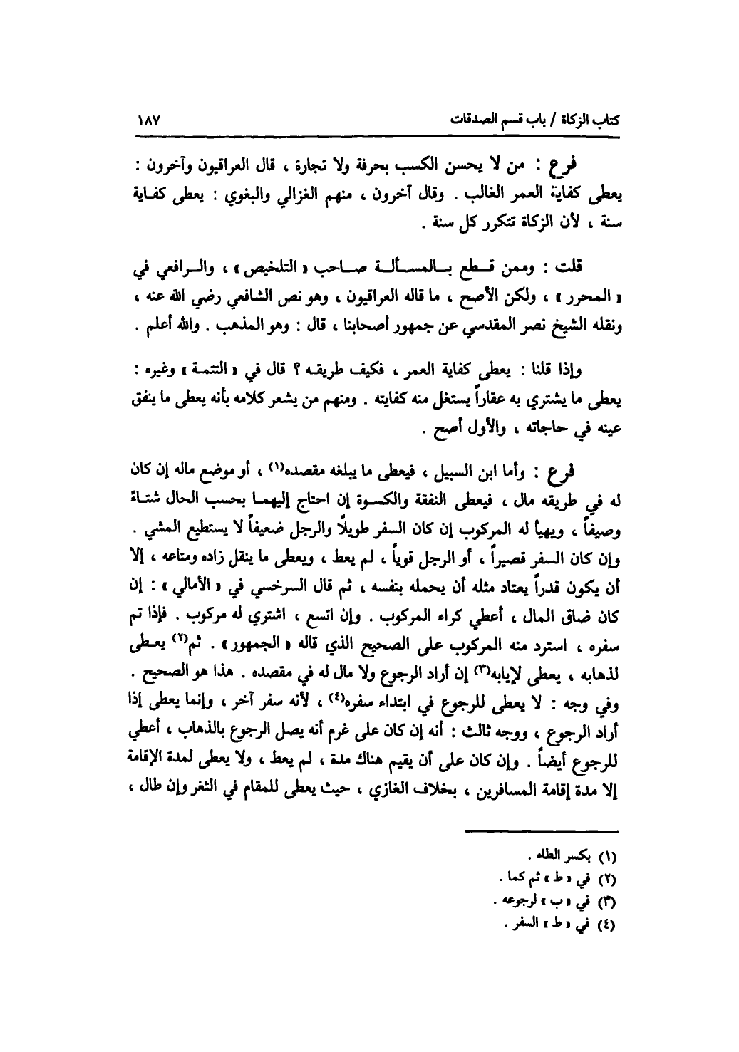 فرع من لا يحسن الكسب بحرفة ولا تجارة، قال العراقيون وآخرون: يعطى كفاية العمر الغالب. وقال آخرون، منهم الغزالي والبغوي: يعطى كفاية سنة، لان الزكاة تتكرر كل سنة. قلت: وممن قطع بالمسألة صاحب التلخيص، والرافعي في المحرر، ولكن الاصح ما قاله العراقيون، وهو نص الشافعي رضي الله عنه، ونقله الشيخ نصر المقدسي عن جمهور أصحابنا، قال: وهو المذهب. والله أعلم. وإذا قلنا: يعطى كفاية العمر، فكيف طريقه ؟ قال في التتمة وغيره: يعطى ما يشتري به عقارا يستغل منه كفايته. ومنهم من يشعر كلامه بأنه يعطى ما ينفق عينه في حاجاته، والاول أصح. فرع وأما ابن السبيل، فيعطى ما يبلغه مقصده، أو موضع ماله إن كان له في طريقه مال، فيعطى النفقة والكسوة إن احتاج إليهما بحسب الحال شتاء وصيفا، ويهيأ له المركوب إن كان السفر طويلا والرجل ضعيفا لا يستطيع المشي. وإن كان السفر قصيرا، أو الرجل قويا، لم يعط، ويعطى ما ينقل زاده ومتاعه، إلا أن يكون قدرا يعتاد مثله أن يحمله بنفسه، ثم قال السرخسي في الامالي: إن كان ضاق المال، أعطي كراء المركوب. وإن اتسع، اشتري له مركوب. فإذا تم سفره، استرد منه المركوب على الصحيح الذي قاله الجمهور. ثم كما يعطى لذهابه، يعطى لايابه إن أراد الرجوع ولا مال له في مقصده. هذا هو الصحيح. وفي وجه: لا يعطى للرجوع في ابتداء السفر، لانه سفر آخر، وإنما يعطى إذا أراد للرجوع، ووجه ثالث: أنه إن كان على عزم أنه يصل الرجوع بالذهاب، أعطي للرجوع أيضا. وإن كان على أن يقيم هناك مدة، لم يعط، ولا يعطى لمدة الاقامة إلا مدة إقامة المسافرين، بخلاف الغازي، حيث يعطى للمقام في الثغر وإن طال،
