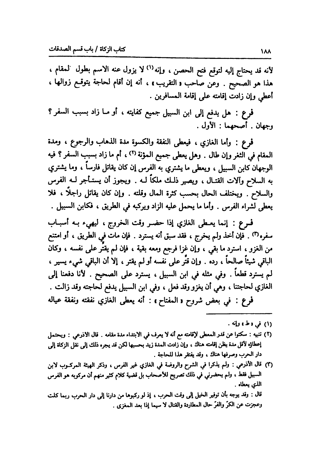 لانه قد يحتاج إليه لتوقع فتح الحصن، وإنه لا يزول عنه الاسم لطول المقام، هذا هو الصحيح. وعن صاحب التقريب، أنه إن أقام لحاجة يتوقع زوالها، أعطي وإن زادت إقامته على إقامة المسافرين. فرع هل يدفع إلى ابن السبيل جميع كفايته، أو ما زاد بسبب السفر ؟ وجهان. أصحهما: الاول. فرع وأما الغازي، فيعطى النفقة والكسوة مدة الذهاب والرجوع، ومدة المقام في الثغر وإن طال. وهل يعطى جميع المؤنة، أم ما زاد بسبب السفر ؟ فيه الوجهان كابن السبيل، ويعطى ما يشتري به الفرس إن كان يقاتل فارسا، وما يشتري به السلاح وآلات القتال، ويصير ذلك ملكا له. ويجوز أن يستأجر له الفرس والسلاح. ويختلف الحال بحسب كثرة المال وقلته. وإن كان يقاتل راجلا، فلا يعطى لشراء الفرس. وأما ما يحمل عليه الزاد ويركبه في الطريق، فكابن السبيل. فرع إنما يعطى الغازي إذا حضر وقت الخروج، ليهئ به أسباب سفره. فإن أخذ ولم يخرج، فقد سبق أنه يسترد. فإن مات في الطريق، أو امتنع من الغزو، استرد ما بقي، وإن غزا فرجع ومعه بقية، فإن لم يقتر على نفسه، وكان الباقي شيئا صالحا، رده. وإن قتر على نفسه أو لم يقتر، إلا أن الباقي شئ يسير، لم يسترد قطعا. وفي مثله في ابن السبيل، يسترد على الصحيح، لانا دفعنا إلى الغازي لحاجتنا، وهي أن يغزو وقد فعل، وفي ابن السبيل يدفع لحاجته وقد زالت. فرع في بعض شروح المفتاح: أنه يعطى الغازي نفقته ونفقة عياله