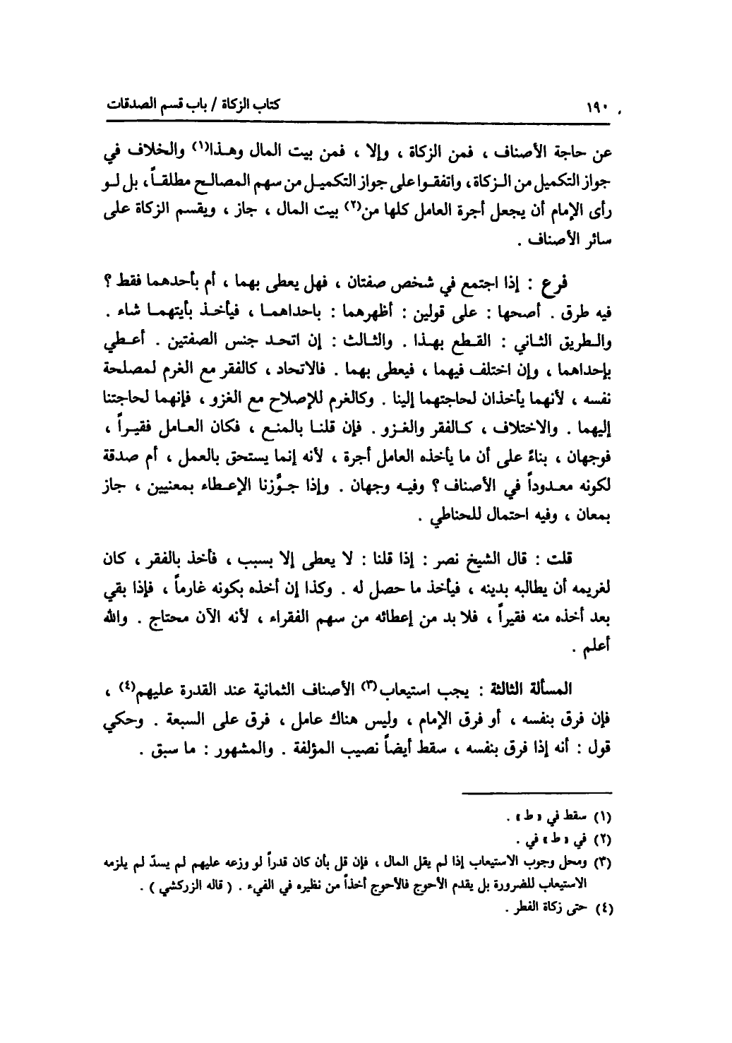 عن حاجة الاصناف، فمن الزكاة، وإلا، فمن بيت المال. والخلاف في جواز التكميل من الزكاة، واتفقوا على جواز التكميل من سهم المصالح مطلقا، بل لو رأى الامام أن يجعل أجرة العامل كلها في بيت المال، جاز، ويقسم الزكاة على سائر الاصناف. فرع إذا اجتمع في شخص صفتان، فهل يعطى بهما، أم بأحدهما فقط ؟ فيه طرق. أصحها: على قولين. أظهرهما: بإحداهما، فيأخذ بأيتهما شاء. والطريق الثاني: القطع بهذا. والثالث: إن اتحد جنس الصفتين، أعطي بإحداهما، وإن اختلف فيهما، فيعطى بهما. فالاتحاد، كالفقر مع الغرم لمصلحة نفسه، لانهما يأخذان لحاجتهما إلينا. وكالغرم للاصلاح مع الغزو، فإنهما لحاجتنا إليهما. والاختلاف، كالفقر والغزو. فإن قلنا بالمنع، فكان العامل فقيرا، فوجهان. بناء على أن ما يأخذه العامل أجرة، لانه إنما يستحق بالعمل، أم صدقة لكونه معدودا في الاصناف ؟ وفيه وجهان. وإذا جوزنا الاعطاء بمعنيين، جاز بمعان، وفيه احتمال للحناطي. قلت: قال الشيخ نصر: إذا قلنا: لا يعطى إلا بسبب، فأخذ بالفقر، كان لغريمه أن يطالبه بدينه، فيأخذ ما حصل له. وكذا إن أخذه بكونه غارما، فإذا بقي بعد أخذه منه فقيرا، فلا بد من إعطائه من سهم الفقراء، لانه الآن محتاج. والله أعلم. المسألة الثالثة: يجب استيعاب الاصناف الثمانية عند القدرة عليهم، فإن فرق بنفسه، أو فرق الامام، وليس هناك عامل، فرق على السبعة. وحكي قول: أنه إذا فرق بنفسه، سقط أيضا نصيب المؤلفة. والمشهور: ما سبق.
