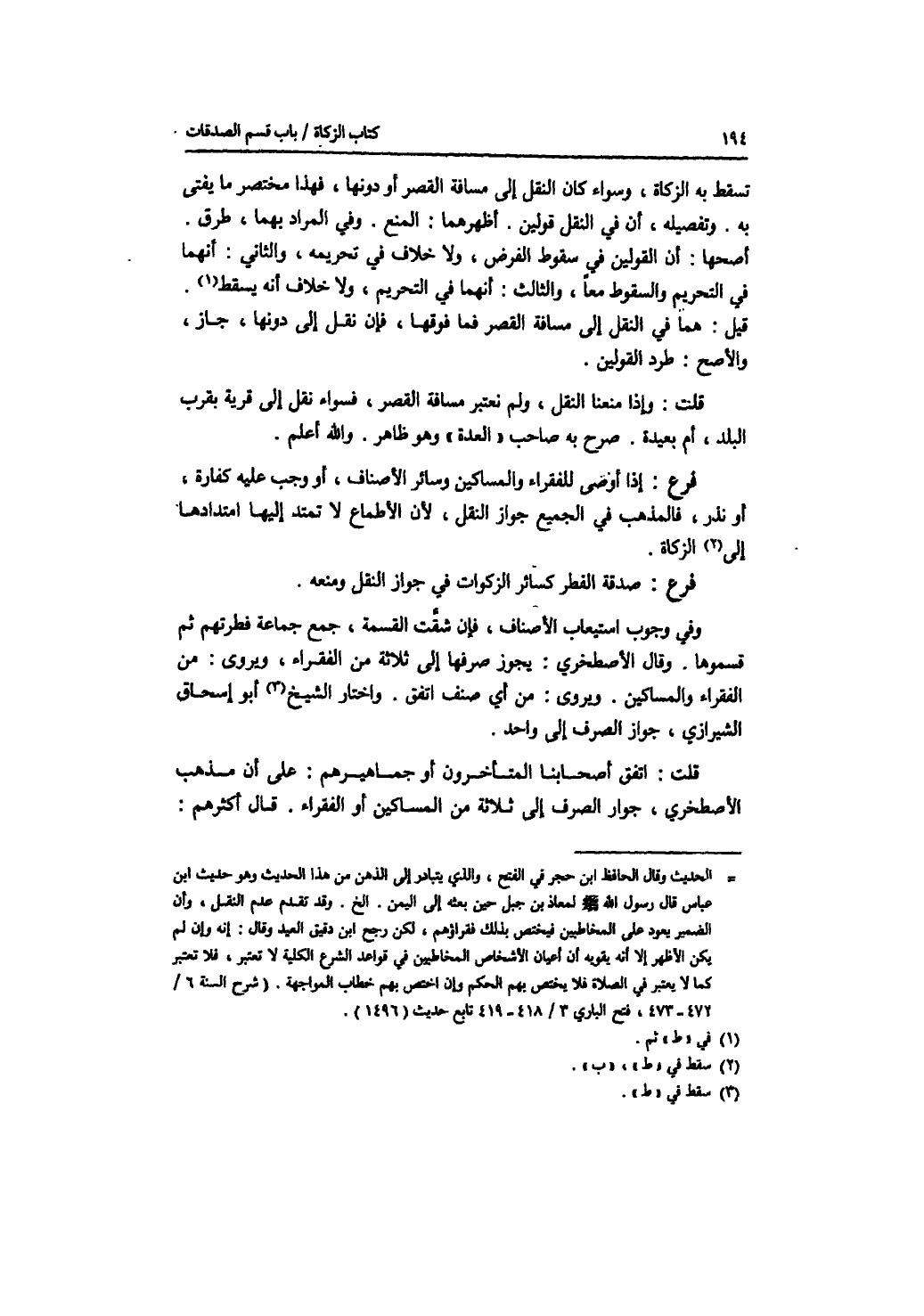 تسقط به الزكاة، وسواء كان النقل إلى مسافة القصر أو دونها، فهذا مختصر ما يفتى به. وتفصيله، أن في النقل قولين. أظهرهما: المنع. وفي المراد بهما، طرق. أصحها: أن القولين في سقوط الفرض، ولا خلاف في تحريمه، والثاني: أنهما في التحريم والسقوط معا، والثالث: أنهما في التحريم، ولا خلاف أنه يسقط. ثم قيل: هما في النقل إلى مسافة القصر فما فوقها، فإن نقل إلى دونها، جاز، والاصح: طرد القولين. قلت: وإذا منعنا النقل، ولم نعتبر مسافة القصر، فسواء نقل إلى قرية بقرب البلد، أم بعيدة. صرح به صاحب العدة وهو ظاهر. والله أعلم. فرع إذا أوصى للفقراء والمساكين وسائر الاصناف، أو وجب عليه كفارة، أو نذر، فالمذهب في الجميع جواز النقل، لان الاطماع لا تمتد إليها امتدادها إلي للزكاة. فرع صدقة الفطر كسائر الزكوات في جواز النقل ومنعه، وفي وجوب استيعاب الاصناف، فإن شقت القسمة، جمع جماعة فطرتهم ثم قسموها. وقال الاصطخري: يجوز صرفها إلى ثلاثة من الفقراء، ويروى: من الفقراء والمساكين. ويروى: من أي صنف اتفق. واختار أبو إسحق الشيرازي، جواز الصرف إلى واحد. قلت: اتفق أصحابنا المتأخرون أو جماهيرهم: على أن مذهب الاصطخري، جواز الصرف إلى ثلاثة من المساكين والفقراء. قال أكثرهم: