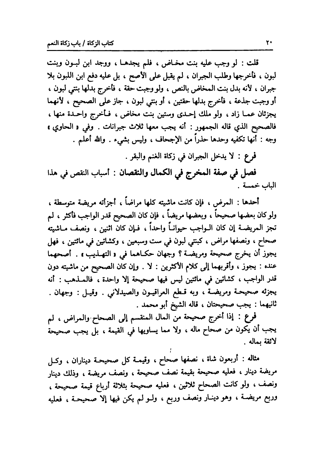 قلت: لو وجب عليه بنت مخاض، فلم يجدها، ووجد ابن لبون وبنت لبون، فأخرجها وطلب الجبران، لم يقبل على الاصح، بل عليه دفع ابن اللبون بلا جبران، لانه بدل بنت المخاض بالنص، ولو وجبت حقة، فأخرج بدلها بنتي لبون، أو وجبت جذعة، فأخرج بدلها حقتين، أو بنتي لبون، جاز على الصحيح، لانهما يجزئان عما زاد، ولو ملك إحدى وستين بنت مخاض، فأخرج واحدة منها، فالصحيح الذي قاله الجمهور: أنه يجب معها ثلاث جبرانات. وفي الحاوي وجه: أنها تكفيه وحدها حذرا من الاجحاف، وليس بشئ. والله أعلم. فرع لا يدخل الجبران في زكاة الغنم والبقر. فصل في صفة المخرج في الكمال والنقصان أسباب النقص في هذا الباب خمسة. أحدها: المرض، فإن كانت ماشيته كلها مراضا، أجزأته مريضة متوسطة، ولو كان بعضها صحيحا، وبعضها مريضا، فإن كان الصحيح قدر الواجب فأكثر، لم تجز المريضة إن كان الواجب حيوانا واحدا، فإن كان اثنين ونصف ماشيته صحاح، ونصفها مراض، كبنتي لبون في ست وسبعين، وكشاتين في مائتين، فهل يجوز أن يخرج صحيحة ومريضة ؟ وجهان حكاهما في التهذيب. أصحهما عنده: يجوز، وأقربهما إلى كلام الاكثرين: لا. وإن كان الصحيح من ماشيته دون قدر الواجب، كشاتين في مائتين ليس فيها صحيحة إلا واحدة، فالمذهب: أنه يجزئه صحيحة ومريضة، وبه قطع العراقيون والصيدلاني. وقيل: وجهان. ثانيهما: يجب صحيحتان، قاله الشيخ أبو محمد. فرع: إذا أخرج صحيحة من المال المنقسم إلى الصحاح والمراض، لم يجب أن يكون من صحاح ماله، ولا مما يساويها في القيمة، بل يجب صحيحة لائقة بماله. مثاله: أربعون شاة، نصفها صحاح، وقيمة كل صحيحة ديناران، وكل مريضة دينار، فعليه صحيحة بقيمة نصف صحيحة، ونصف مريضة، وذلك دينار ونصف، ولو كانت الصحاح ثلاثين، فعليه صحيحة بثلاثة أرباع قيمة صحيحة، وربع مريضة، وهو دينار ونصف وربع، ولو لم يكن فيها إلا صحيحة، فعليه