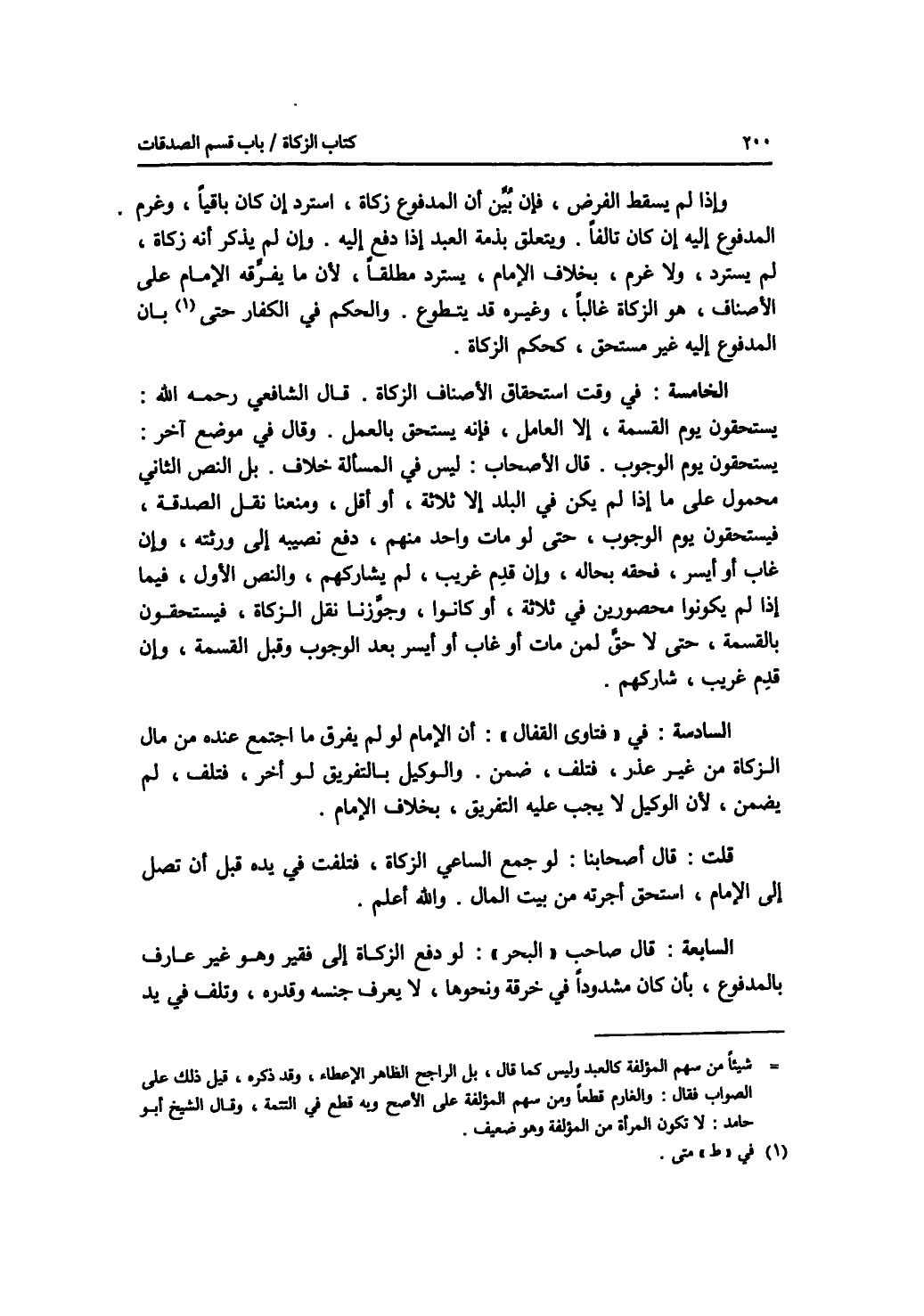 وإذا لم يسقط الفرض، فإن بين أن المدفوع زكاة، استرد إن كان باقيا، وغرم المدفوع إليه إن كان تالفا. ويتعلق بذمه العبد إذا دفع إليه. وإن لم يذكر أنه زكاة، لم يسترد، ولا غرم، بخلاف الامام، يسترد مطلقا، لان ما يفرقه الامام على الاصناف، هو الزكاة غالبا، وغيره قد يتطوع. والحكم في الكفارة متى بان المدفوع إليه غير مستحق، كحكم الزكاة. الخامسة: في وقت استحقاق الاصناف الزكاة. قال الشافعي رحمه الله: يستحقون يوم القسمة، إلا العامل، فإنه يستحق بالعمل. وقال في موضع آخر: يستحقون يوم الوجوب. قال الاصحاب: ليس في المسألة خلاف. بل النص الثاني محمول على ما إذا لم يكن في البلد إلا ثلاثة، أو أقل، ومنعنا نقل الصدقة، فيستحقون يوم الوجوب، حتى لو مات واحد منهم، دفع نصيبه إلى ورثته، وإن غاب أو أيسر، فحقه بحاله، وإن قدم غريب، لم يشاركهم، والنص الاول، فيما إذا لم يكونوا محصورين في ثلاثة، أو كانوا، وجوزنا نقل الزكاة، فيستحقون بالقسمة، حتى لا حق لمن مات أو غاب أو أيسر بعد الوجوب وقبل القسمة، وإن قدم غريب، شاركهم. السادسة: في فتاوى القفال: أن الامام لو لم يفرق ما اجتمع عنده من مال الزكاة من غير عذر، فتلف، ضمن. والوكيل بالتفريق لو أخر، فتلف، لم يضمن، لان خلوكيل لا يجب عليه التفريق، بخلاف الامام. قلت: قال أصحابنا: لو جمع الساعي الزكاة، فتلفت في يده قبل أن تصل إلى الامام، استحق أجرته من بيت المال. والله أعلم. السابعة: قال صاحب البحر: لو دفع الزكاة إلى فقير وهو غير عارف بالمدفوع، بأن كان مشدودا في خرقة ونحوها، لا يعرف جنسه وقدره، وتلف في يد