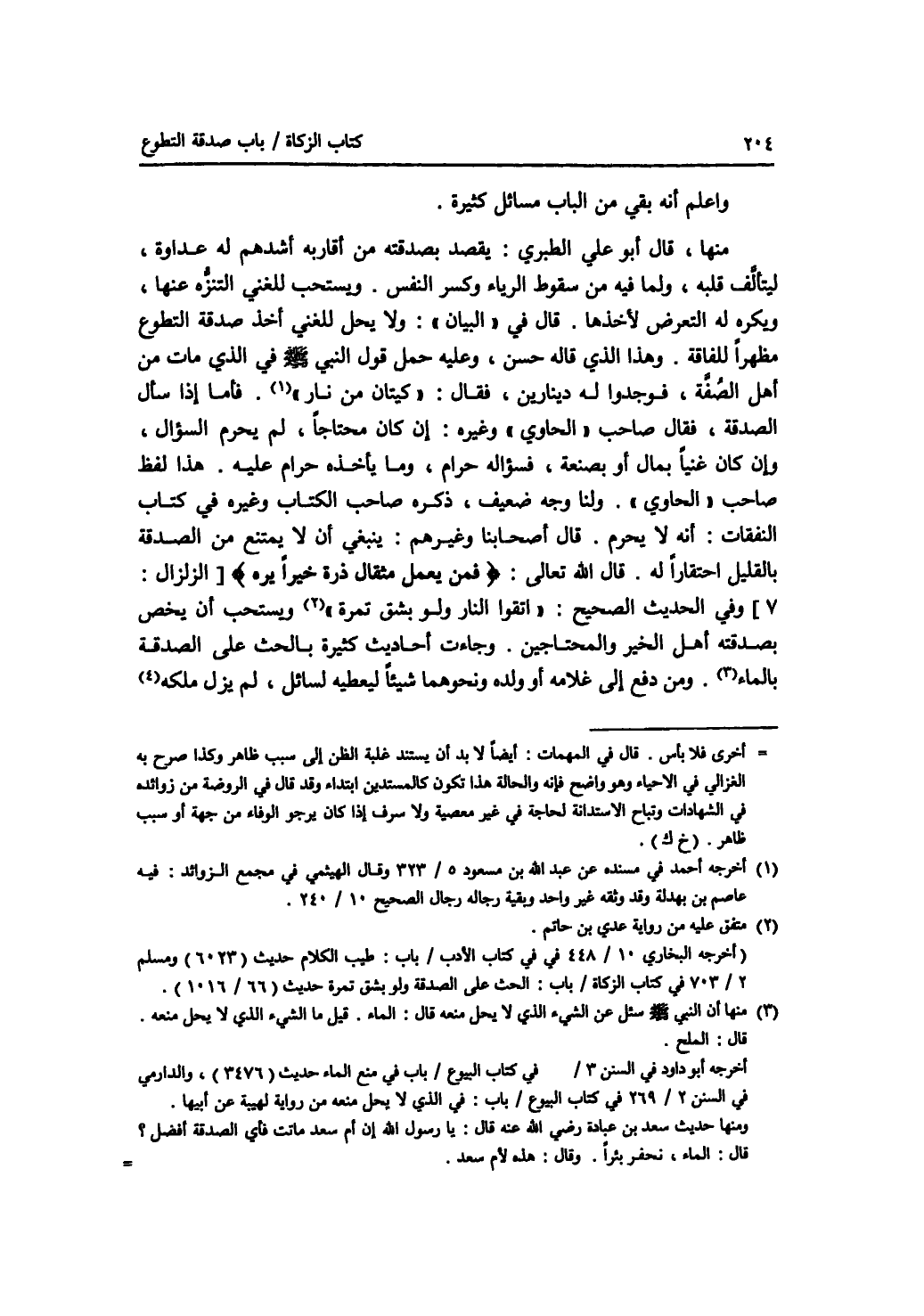 واعلم أنه بقي من الباب مسائل كثيرة. منها، قال أبو علي الطبري: يقصد بصدقته من أقاربه أشدهم له عداوة، ليتألف قلبه، ولما فيه من سقوط الرياء وكسر النفس. ويستحب للغني التنزه عنها، ويكره له التعرض لاخذها. قال في البيان: ولا يحل للغني أخذ صدقة التطوع مظهرا للفاقة. وهذا الذي قاله حسن، وعليه حمل قول النبي - صلى الله عليه وسلم - في الذي مات من أهل الصفة، فوجدوا له دينارين، فقال: كيتان من نار. فأما إذا سأل الصدقة، فقال صاحب الحاوي وغيره: إن كان محتاجا، لم يحرم السؤال، وإن كان غنيا بمال أو صنعة، فسؤاله حرام، وما يأخذه حرام عليه. هذا لفظ صاحب الحاوي. ولنا وجه ضعيف، ذكره صاحب الكتاب وغيره في كتاب النفقات: أنه لا يحرم. قال أصحابنا وغيرهم: ينبغي أن لا يمتنع من الصدقة بالقليل احتقارا له. قال الله تعالى: * (فمن يعمل مثقال ذرة خيرا يره) * [ الزلزال: 7 ] وفي الحديث الصحيح: اتقوا النار ولو بشق تمرة ويستحب أن يخص بصدقته أهل الخير والمحتاجين. وجاءت أحاديث كثيرة بالحث على الصدقة بالماء. ومن دفع إلى غلامه أو ولده ونحوهما شيئا ليعطيه لسائل، لم يزل ملكه عنه