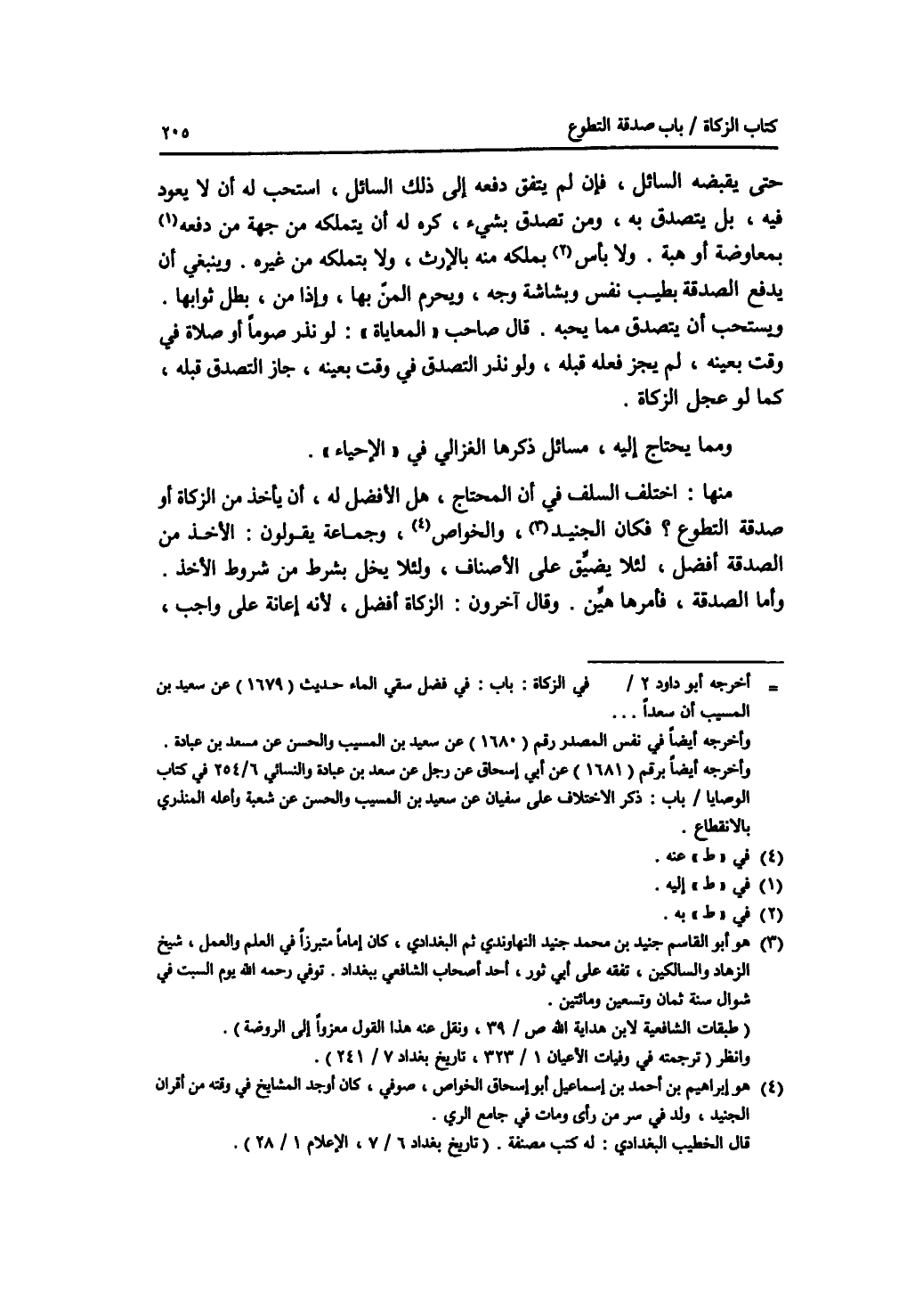 حتى يقبضه السائل، فإن لم يتفق دفعه إلى ذلك السائل، استحب له أن لا يعود فيه، بل يتصدق به، ومن تصدق بشئ، كره له أن يتملكه من جهة من دفعه إليه بمعاوضة أو هبة. ولا بأس به بملكه منه بالارث، ولا بتملكه من غيره. وينبغي أن يدفع الصدقة بطيب نفس وبشاشة وجه، ويحرم المن بها، وإذا من، بطل ثوابها. ويستحب أن يتصدق مما يحبه. قال صاحب المعاياة: لو نذر صوما أو صلاة في وقت بعينه، لم يجز فعله قبله، ولو نذر التصدق في وقت بعينه، جاز التصحق قبله، كما لو عجل الزكاة. ومما يحتاج إليه، مسائل ذكرها الغزالي في الاحياء. منها: اختلف السلف في أن المحتاج، هل الافضل له، أن يأخذ من الزكاة أو صدقة التطوع ؟ فكان الجنيد، والخواص، وجماعة يقولون: الاخذ من الصدقة أفضل، لئلا يضيق على الاصناف، ولئلا يخل بشرط من شروط الاخذ. وأما الصدقة، فأمرها هين. وقال آخرون: الزكاة أفضل، لانه إعانة على واجب،