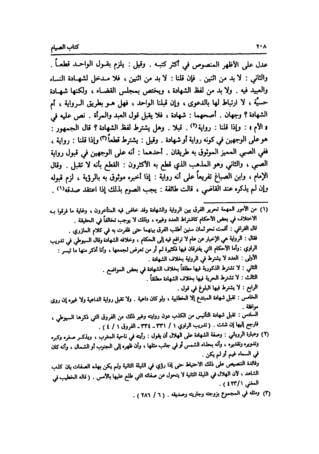 عدل على الاظهر المنصوص في أكثر كتبه. وقيل: يلزم بقول الواحد قطعا. والثاني: لا بد من اثنين. فإن قلنا: لا بد من اثنين، فلا مدخل لشهادة النساء والعبيد فيه. ولا بد من لفظ الشهادة، ويختص بمجلس القضاء، ولكنها شهادة حسية، لا ارتباط لها بالدعوى، وإن قبلنا الواحد، فهل هو بطريق الرواية، أم الشهادة ؟ وجهان. أصحهما: شهادة، فلا يقبل قول العبد والمرأة. نص عليه في الام: وإذا قلنا: رواية، قبلا. وهل يشترط لفظ الشهادة ؟ قال الجمهور: هو على الوجهين في كونه رواية أو شهادة. وقيل: يشترط قطعا. وإذا قلنا: رواية، ففي الصبي المميز الموثوق به طريقان. أحدهما: أنه على الوجهين في قبول رواية الصبي، والثاني: وهو المذهب الذي قطع به الاكثرون: القطع بأنه لا تقبل. وقال الامام، وابن الصباغ تفريعا على أنه رواية: إذا أخبره موثوق به بالرؤية، لزم قبوله وإن لم يذكره عند القاضي، وقالت طائفة: يجب الصوم بذلك إذا اعتقد صدقه.