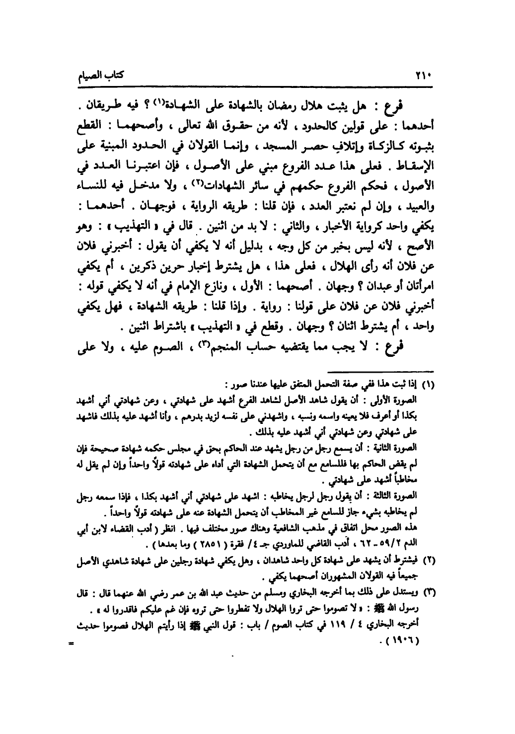 فرع هل يثبت هلال رمضان بالشهادة على الشهادة ؟ فيه طريقان. أحدهما: على قولين كالحدود، لانه من حقوق الله تعالى، وأصحهما: القطع بثبوته كالزكاة وإتلاف حصر المسجد، وإنما القولان في الحدود المبنية على الاسقاط. فعلى هذا عدد الفروع مبني على الاصول، فإن اعتبرنا العدد في الاصول، فحكم الفروع حكمهم في سائر الشهادات، ولا مدخل فيه للنساء والعبيد، وإن لم نعتبر العدد، فإن قلنا: طريقه الرواية، فوجهان. أحدهما: يكفي واحد كرواية الاخبار، والثاني: لا بد من اثنين. قال في التهذيب: وهو الاصح، لانه ليس بخبر من كل وجه، بدليل أنه لا يكفي أن يقول: أخبرني فلان عن فلان أنه رأى الهلال، فعلى هذا، هل يشترط إخبار حرين ذكرين، أم يكفي امرأتان أو عبدان ؟ وجهان. أصحهما: الاول، ونازع الامام في أنه لا يكفي قوله: أخبرني فلان عن فلان على قولنا: رواية. وإذا قلنا: طريقه الشهادة، فهل يكفي واحد، أم يشترط اثنان ؟ وجهان. وقطع في التهذيب باشتراط اثنين. فرع لا يجب مما يقتضيه حساب المنجم، الصوم عليه، ولا على