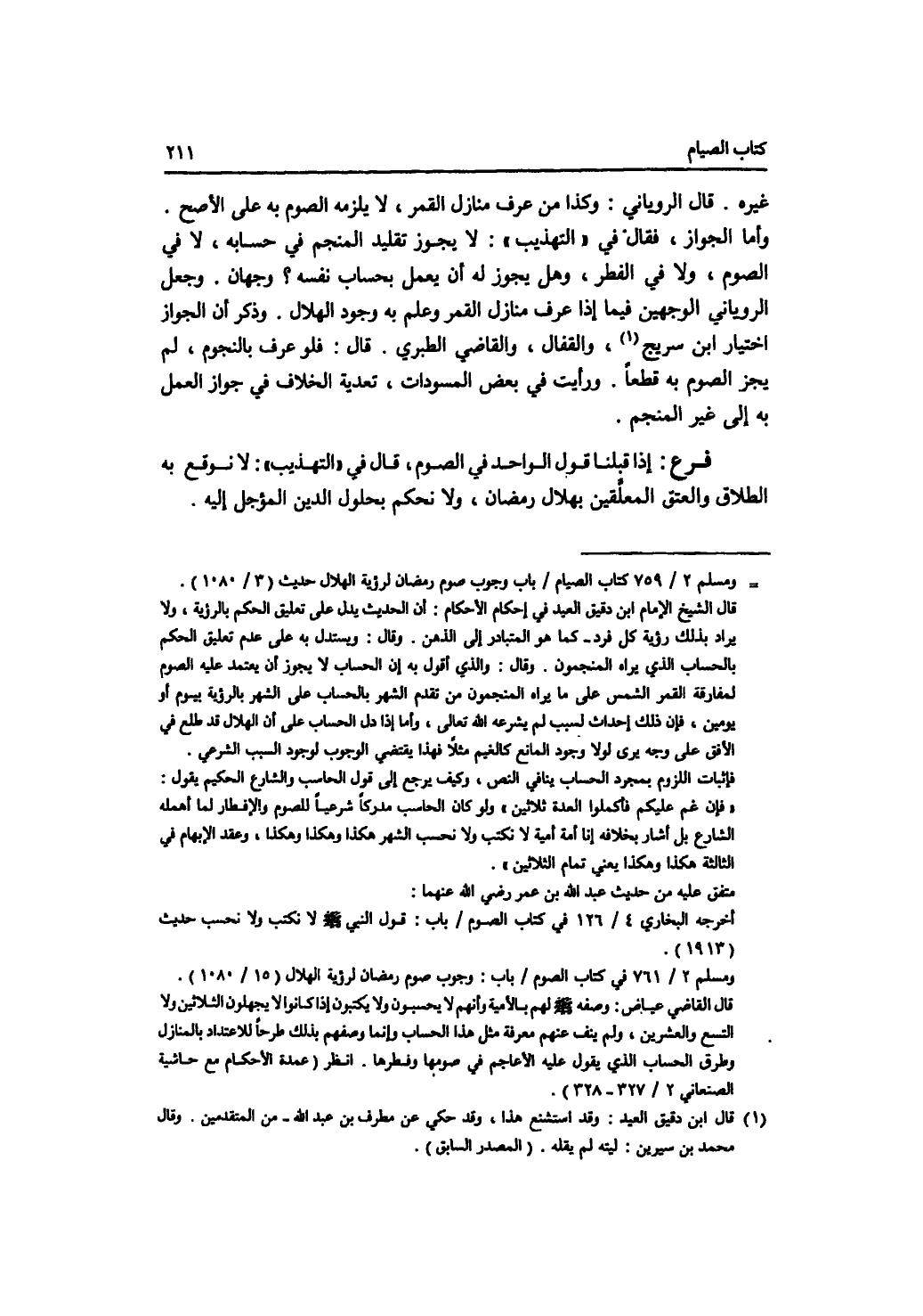 غيره. قال الروياني: وكذا من عرف منازل القمر، لا يلزمه الصوم به على الاصح. وأما الجواز، فقال في التهذيب: لا يجوز تقليد المنجم في حسابه، لا في الصوم، ولا في الفطر، وهل يجوز له أن يعمل بحساب نفسه ؟ وجها. وجعل الروياني الوجهين فيما إذا عرف منازل القمر وعلم به وجود الهلال. وذكر أن الجواز اختيار ابن سريج، والقفال، والقاضي الطبري. قال: فلو عرف بالنجوم، لم يجز الصوم به قطعا. ورأيت في بعض المسودات، تعدية الخلاف في جواز العمل به إلى غير المنجم. فرع إذا قبلنا قول الواحد في الصوم، قال في التهذيب: لا نوقع به الطلاق والعتق المعلقين بهلال رمضان، ولا نحكم بحلول الدين المؤجل إليه.
