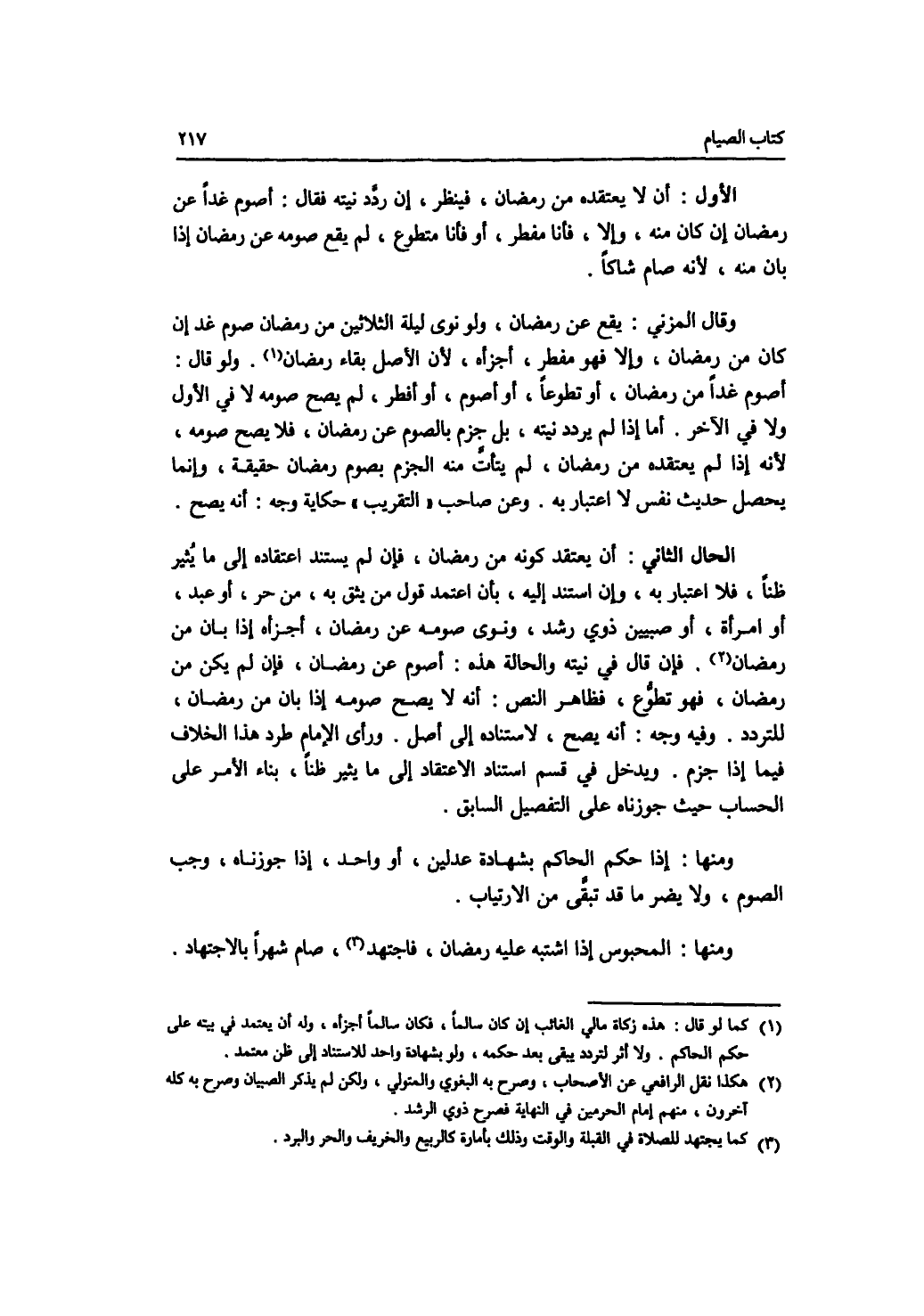 الاول: أن لا يعتقده من رمضان، فينظر، إن ردد نيته فقال: أصوم غدا عن رمضان إن كان منه، وإلا، فأنا مفطر، أو فأنا متطوع، لم يقع صومه عن رمضان إذا بان منه، لجنه صام شاكا. وقال المزني: يقع عن رمضان. ولو نوى ليلة الثلاثين من رمضان صوم غد إن كان من رمضان، وإلا فهو مفطر، أجزأه، لان الاصل بقاء رمضان. ولو قال: أصوم غدا من رمضان، أو تطوعا، أو أصوم، أو أفطر، لم يصح صومه لا في الاول ولا في الآخر. أما إذا لم يردد نيته، بل جزم بالصوم عن رمضان، فلا يصح صومه، لانه ذا لم يعتقده من رمضان، لم يتأت منه الجزم بصوم رمضان حقيقة، وإنما يحصل حديث نفس لا اعتبار به. وعن صاحب التقريب حكاية وجه: أنه يصح. الحال الثاني: أن يعتقد كونه من رمضان، فإن لم يستند اعتقاده إلى ما يثير ظنا، فلا اعتبار به، وإن استند إليه، بأن اعتمد قول من يثق به، من حر، أو عبد، أو امرأة، أو صبيين ذوي رشد، ونوى صومه عن رمضان، أجزأه إذا بان من رمضان. فإن قال في نيته والحالة هذه: أصوم عن رمضان، فإن لم يكن من رمضان، فهو تطوع، فظاهر النص: أنه لا يصح صومه إذا بان من رمضان، للتردد. وفيه وجه: أنه يصح، لاستناده إلى أصل. ورأى الامام طرد هذا الخلاف فيما إذا جزم. ويدخل في قسم استناد الاعتقاد إلى ما يثير ظنا، بناء الامر على الحساب حيث جوزناه على التفصيل السابق. ومنها: إذا حكم الحاكم بشهادة عدلين، أو واحد، إذا جوزناه، وجب الصوم، ولا يضر ما قد تبقى من الارتياب. ومنها: المحبوس إذا اشتبه عليه رمضان، فاجتهد، صام شهرا بالاجتهاد.