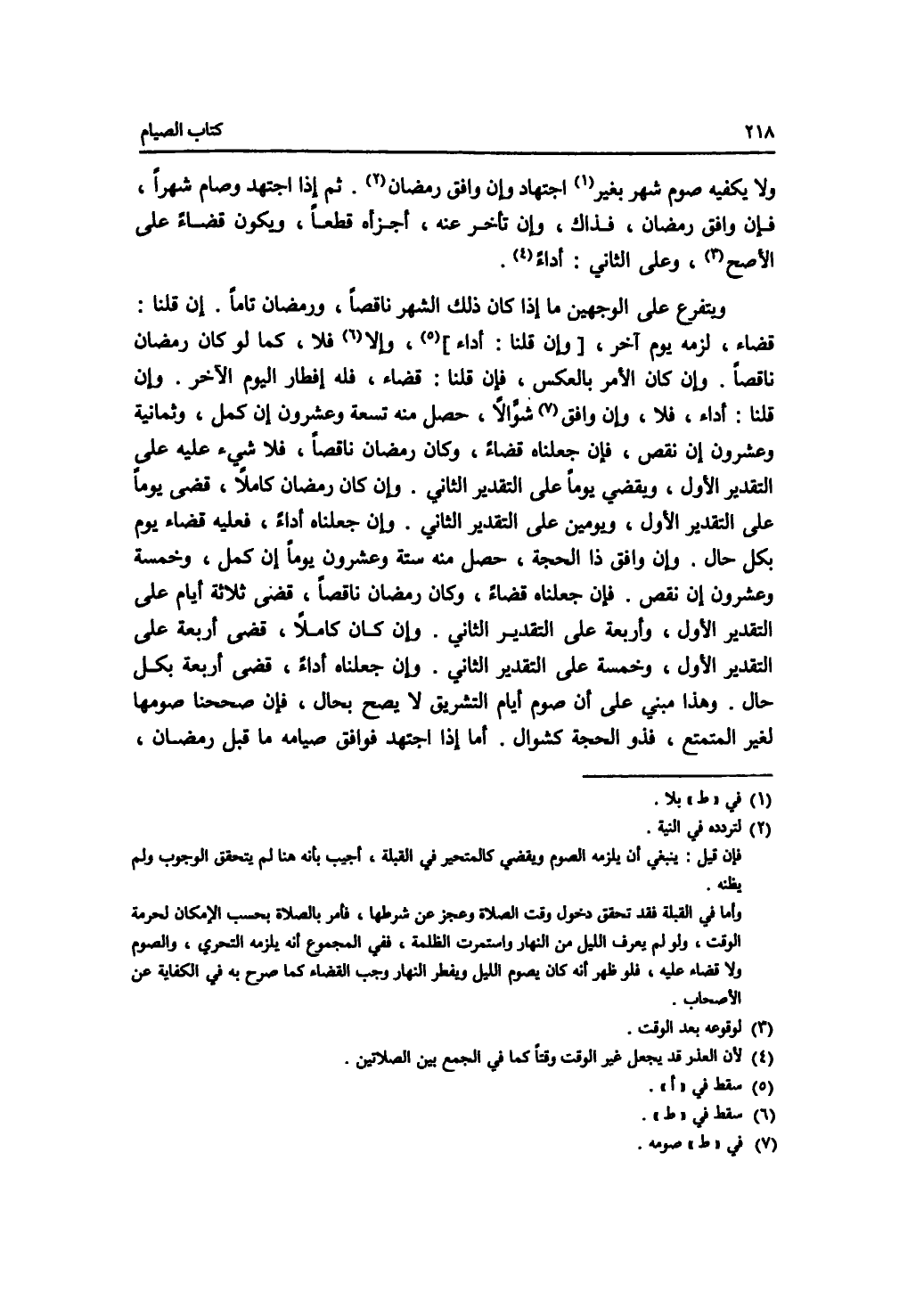 ولا يكفيه صوم شهر بلا اجتهاد وإن وافق رمضان. ثم إذا اجتهد فصام شهرا، فإن وافق رمضان، فذاك، وإن تأخر عنه، أجزأه قطعا، ويكون قضاء على الاصح، وعلى الثاني: أداء. ويتفرع على الوجهين ما إذا كان ذلك الشهر ناقصا، ورمضان تاما. إن قلنا: قضاء، لزمه يوم آخر، وإن قلنا: أداء، فلا، كما لو كان رمضان ناقصا. وإن كان الامر بالعكس، فإن قلنا: قضاء، فله إفطار اليوم الآخر. وإن قلنا: أداء، فلا، وإن وافق صومه شوالا، حصل منه تسعة وعشرون إن كمل، أو ثمانية وعشرون إن نقص، فإن جعلناه قضاء، وكان رمضان ناقصا، فلا شئ عليه على التقدير الاول، ويقضي يوما على التقدير الثاني. وإن كان رمضان كاملا، قضى يوما على التقدير الاول، ويومين على التقدير الثاني. وإن جعلناه أداء، فعليه قضاء يوم بكل حال. وإن وافق ذا الحجة، حصل منه ستة وعشرون يوما إن كمل، وخمسة وعشرون إن نقص. فإن جعلناه قضاء، وكان رمضان ناقصا، قضى ثلاثة أيام على التقدير الاول، وأربعة على التقدير الثاني. وإن كان كاملا، قضى أربعة على التقدير الاول، وخمسة على التقدير الثاني. وإن جعلناه أداء، قضى أربعة بكل حال. وهذا مبني على أن صوم أيام التشريق لا يصح بحال، فإن صححنا صومها لغير المتمتع، فذو الحجة كشوال. أما إذا اجتهد فوافق صيامه ما قبل رمضان،