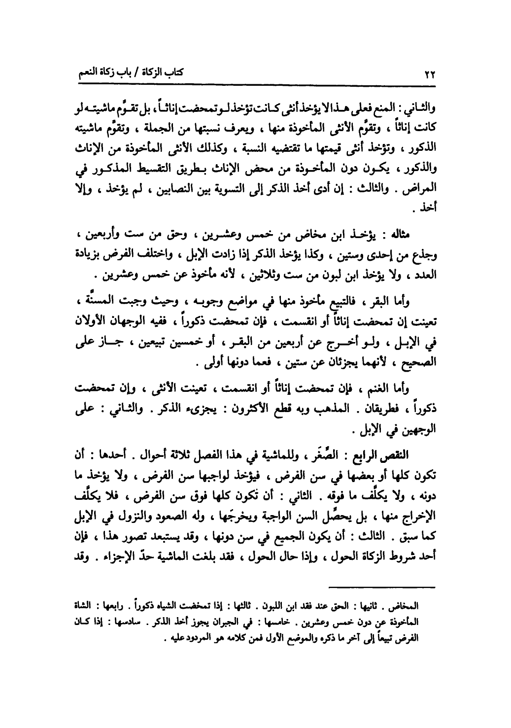 والثاني: المنع، فعلى هذا لا يؤخذ انثى كانت تؤخذ لو تمحضت إناثا، بل تقوم ماشيته لو كانت إناثا، وتقوم الانثى المأخوذة منها، ويعرف نسبتها من الجملة، وتقوم ماشيته الذكور، وتؤخذ أنثى قيمتها ما تقتضيه النذبة، وكذلك الانثى المأخوذة من الاناث والذكور، يكون دون المأخوذة من محض الاناث بطريق التقسيط المذكور في المراض والثالث: إن أدى أخذ الذكر إلى التسوية بين النصابين، لم يؤخذ، وإلا أخذ. مثاله: يؤخذ ابن مخاض من خمس وعشرين، وحق من ست وأربعين، وجذع من إحدى وستين، وكذا يؤخذ الذكر إذا زادت الابل، واختلف الفرض بزيادة العدد، ولا يؤخذ ابن لبون من ست وثلاثين، لانه مأخوذ عن خمس وعشرين. وأما البقر، فالتبيع مأخوذ منها في مواضع وجوبه، وحيث وجبت المسنة، تعينت إن تمحضت إناثا أو انقسمت، فإن تمحضت ذكورا، ففيه الوجهان الاولان في الابل، ولو أخرج عن أربعين من البقر، أو خمسين تبيعين، جاز على الصحيح، لانهما يجزئان عن ستين، فعما دونها أولى. وأما الغنم، فإن تمحضت إناثا أو انقسمت، تعينت الانثى، وإن تمحضت ذكورا، فطريقان. المذهب وبه قطع الاكثرون: يجزئ الذكر. والثاني: على الوجهين في الابل. النقص الرابع: الصغر، وللماشية في هذا الفصل ثلاثة أحوال. أحدها: أن تكون كلها أو بعضها في سن الفرض، فيؤخذ لواجبها سن الفرض، ولا يؤخذ ما دونه، ولا يكلف ما فوقه. الثاني: أن تكون كلها فوق سن الفرض، فلا يكلف الاخراج منها، بل يحصل السن الواجبة ويخرجها، وله الصعود والنزول في الابل كما سبق. الثالث: أن يكون الجميع في سن دونها، وقد يستبعد تصور هذا، فإن أحد شروط الزكاة الحول، وإذا حال الحول، فقد بلغت الماشية حد الاجزاء. وقد