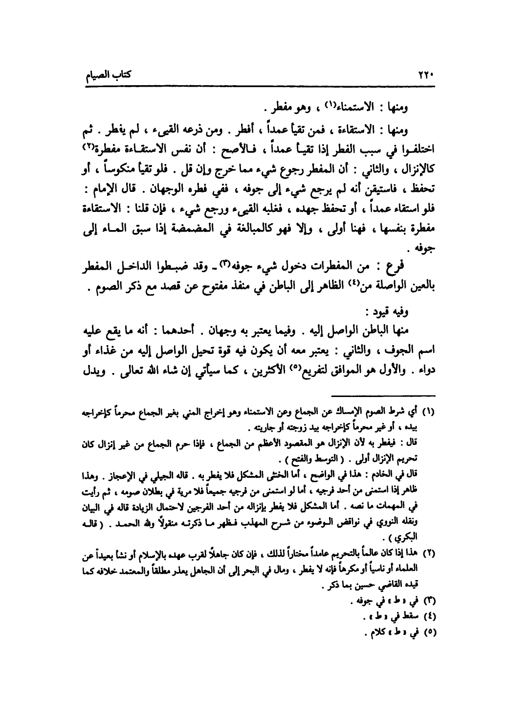 ومنها: الاستمناء، وهو مفطر. ومنها: الاستقاءة، فمن تقيأ عمدا، أفطر. ومن ذرعه القئ، لم يفطر. ثم اختلفوا في سبب الفطر إذا تقيأ عمدا، فالاصح: أن نفس الاستقاءة مفطرة كالانزال، والثاني: أن المفطر رجوع شئ مما خرج وإن قل. فلو تقيأ منكوسا، أو تحفظ، فاستيقن أنه لم يرجع شئ إلى جوفه، ففي فطره الوجهان. قال الامام: فلو استقاء عمدا، أو تحفظ جهده، فغلبه القيئ ورجع شئ، فإن قلنا: الاستقاءة مفطرة بنفسها، فهنا أولى، وإلا فهو كالمبالغة في المضمضة إذا سبق الماء إلى جوفه. فرع من المفطرات دخول شئ في جوفه - وقد ضبطوا الداخل المفطر بالعين الواصلة - الظاهر إلى الباطن في منفذ مفتوح عن قصد مع ذكر الصوم. وفيه قيود: منها الباطن الواصل إليه. وفيما يعتبر به وجهان. أحدهما: أنه ما يقع عليه اسم الجوف، والثاني: يعتبر معه أن يكون فيه قوة تحيل الواصل إليه من غذاء أو دواء. والاول هو الموافق لكلام الاكثرين، كما سيأتي إن شاء الله تعالى. ويدل