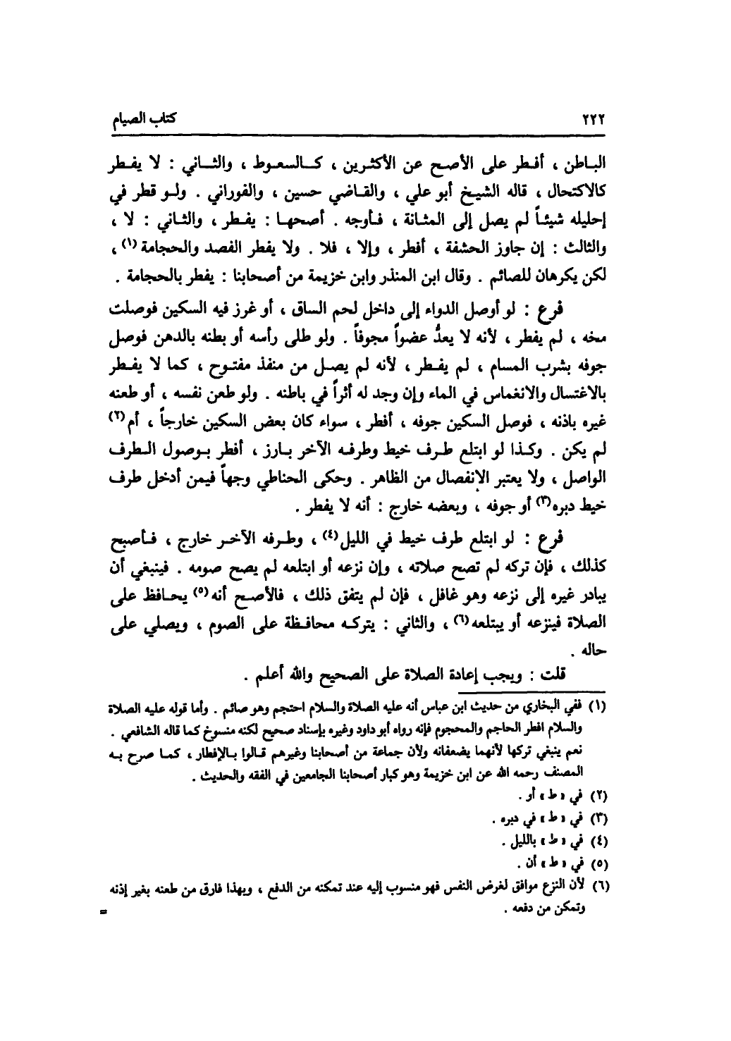 الباطن، أفطر على الاصح عن الاكثرين، كالسعوط، والثاني: لا يفطر كالاكتحال، قاله الشيخ أبو علي، والقاضي حسين، والفوراني. ولو قطر في إحليله شيئا لم يصل إلى المثانة، فأوجه. أصحها: يفطر، والثاني: لا، والثالث: إن جاوز الحشفة، أفطر، وإلا، فلا. ولا يفطر الفصد والحجامة، لكن يكرهان للصائم. وقال ابن المنذر وابن خزيمة من أصحابنا: يفطر بالحجامة. فرع لو أوصل الدواء إلى داخل لحم الساق، أو غرز فيه السكين فوصلت مخه، لم يفطر، لانه لم يعد عضوا مجوفا. ولو طلى رأسه أو بطنه بالدهن فوصل جوفه بشرب المسام، لم يفطر، لانه لم يصل من منفذ مفتوح، كما لا يفطر بالاغتسال والانغماس في الماء وإن وجد له أثرا في باطنه. ولو طعن نفسه، أو طعنه غيره بإذنه، فوصل السكين جوفه، أفطر، سواء كان بعض السكين خارجا، أو لم يكن. وكذا لو ابتلع طرف خيط وطرفها لآخر بارز، أفطر بوصول الطرف الواصل، ولا يعتبر الانفصال من الظاهر. وحكى الحناطي وجها فيمن أدخل طرف خيط في دبره أو جوفه، وبعضه خارج: أنه لا يفطر. فرع لو ابتلع طرف خيط بالليل، وطرفه الآخر خارج، فأصبح كذلك، فإن تركه لم تصح صلاته، وإن نزعه أو ابتلعه لم يصح صومه. فينبغي أن يبادر غيره إلى نزعه وهو غافل، فإن لم يتفق ذلك، فالاصح: أن يحافظ على الصلاة فينزعه أو يبتلعه، والثاني: يتركه محافظة على الصوم، ويصلي على حاله. قلت: ويجب إعادة الصلاة على الصحيح. والله أعلم.