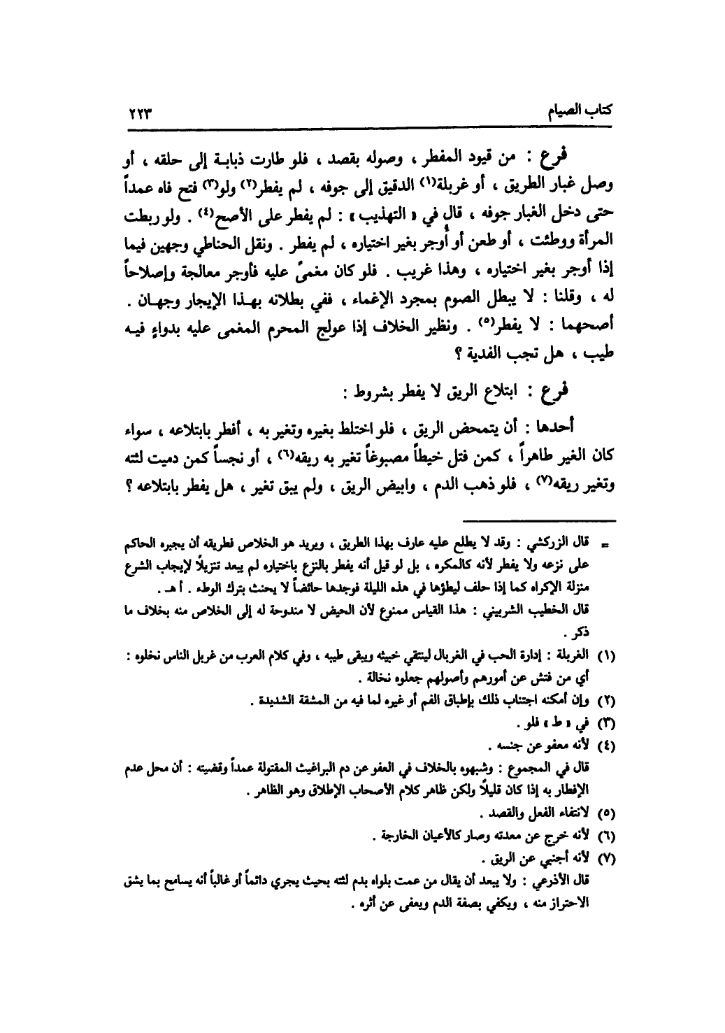 فرع من قيود المفطر وصوله بقصد، فلو طارت ذبابة إلى حلقه، أو وصل غبار الطريق، أو غربلة الدقيق إلى جوفه، لم يفطر. فلو فتح فاه عمدا حتى دخل الغبار جوفه، قال في التهذيب: لم يفطر على الاصح. ولو ربطت المرأة ووطئت، أو طعن أو أوجر بغير اختياره، لم يفطر. ونقل الحناطي وجهين فيما إذا أوجر بغير اختياره، وهذا غريب. فلو كان مغمى عليه فأوجر معالجة وإصلاحا له، وقلنا: لا يبطل الصوم بمجرد الاغماء، ففي بطلانه بهذا الايجار وجهان. أصحهما: لا يفطر. ونظير الخلاف إذا عولج المحرم المغمى عليه بدواء فيه طيب، هل تجب الفدية ؟. فرع ابتلاع الريق لا يفطر بشروط. أحدها: أن يتمحض الريق، فلو اختلط بغيره وتغير به، أفطر بابتلاعه، سواء كان الغير طاهرا، كمن فتل خيطا مصبوغا تغير به ريقه، أو نجسا كمن دميت لثته وتغير ريقه، فلو ذهب الدم، وابيض الريق، ولم يبق تغير، هل يفطر بابتلاعه ؟