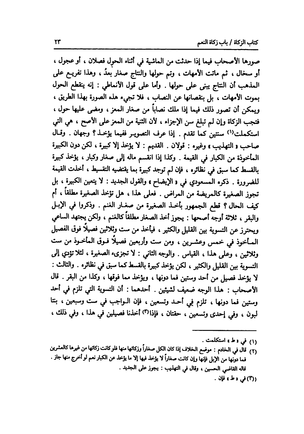 صورها الاصحاب فيما إذا حدثت من الماشية في أثناء الحلول فصلان، أو عجول، أو سخال، ثم ماتت الامهات، وتم حولها والنتاج صغار بعد، وهذا تفريع على المذهب أن النتاج يبنى على حولها. وأما على قول الانماطي: إنه ينقطع الحول بموت الامهات، بل بنقصانها عن النصاب، فلا تجئ هذه الصورة بهذا الطريق، ويمكن أن تصور ذلك فيما إذا ملك نصابا من صغار المعز، ومضى عليها حول، فتجب الزكاة وإن لم تبلغ سن الاجزاء، لان الثنية من المعز على الاصح، هي التي استكملت سنتين كما تقدم. إذا عرف التصوير ففيما يؤخذ ؟ وجهان. وقال صاحب التهذيب وغيره: قولان. القديم: لا يؤخذ إلا كبيرة، لكن دون الكبيرة المأخوذة من الكبار في القيمة. وكذا إذا انقسم ماله إلى صغار وكبار، يؤخذ كبيرة بالقسط كما سبق في نظائره، فإن لم توجد كبيرة بما يقتضيه التقسيط، أخذت القيمة للضرورة. ذكره المسعودي في الايضاح والقول الجديد: لا يتعين الكبيرة، بل تجوز الصغيرة كالمريضة من المراض. فعلى هذا، هل تؤخذ الصغيرة مطلقا، أم كيف الحال ؟ قطع الجمهور بأخذ الصغيرة من صغار الغنم. وذكروا في الابل والبقر، ثلاثة أوجه. أصحها: يجوز أخذ الصغار مطلقا كالغنم، ولكن يجتهد الساعي ويحترز عن التسوية بين القليل والكثير، فيأخذ من ست وثلاثين فصيلا فوق الفصيل المأخوذ في خمس وعشرين، ومن ست وأربعين فصيلا فوق المأخوذ من ست وثلاثين، وعلى هذا، القياس. والوجه الثاني: لا تجزئ الصغيرة، لئلا تؤدي إلى التسوية بين القليل والكثير، لكن يؤخذ كبيرة بالقسط كما سبق في نظائره. والثالث: لا يؤخذ فصيل من أحد وستين فما دونها، ويؤخذ مما فوقها، وكذا من البقر. قال الاصحاب: هذا الوجه ضعيف لشيئين. أحدهما: أن التسوية التي تلزم في أحد وستين فما دونها، تلزم في أحد وتسعين، فإن الواجب في ست وسبعين، بنتا لبون، وفي إحدى وتسعين، حقتان، فإن أخذنا فصيلين في هذا، وفي ذلك،