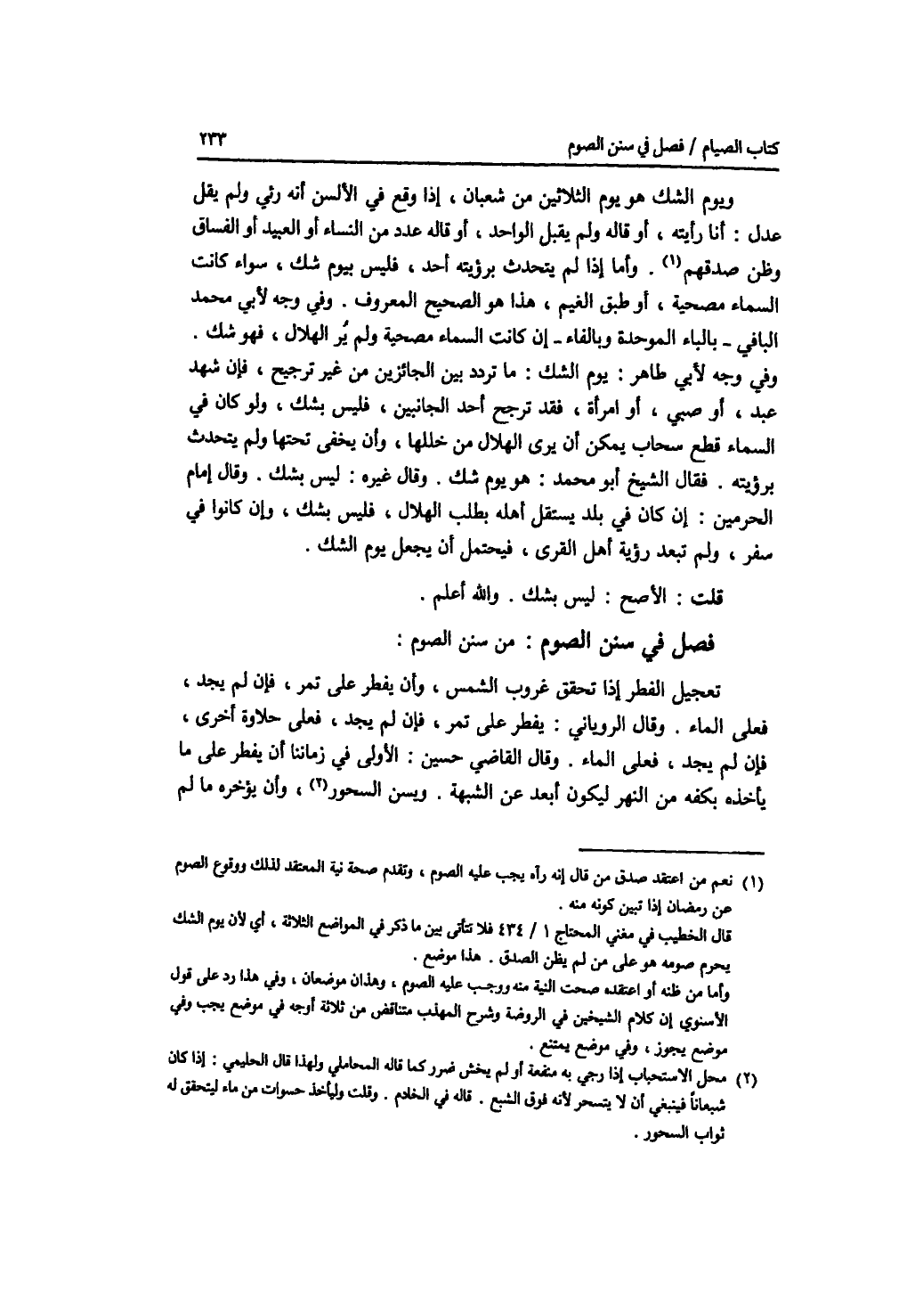 ويوم الشك هو يوم الثلاثين من شعبان، إذا وقع في الالسن أنه رئي ولم يقل عدل: أنا رأيته، أو قاله ولم يقبل الواحد، أو قاله عدد من النساء أو العبيد أو الفساق وظن صدقهم. وأما إذا لم يتحدث برؤيته أحد، فليس بيوم شك، سواء كانت السماء مصحية، أو طبق الغيم، هذا هو الصحيح المعروف. وفي وجه لابي محمد البافي - بالباء الموحدة وبالفاء - إن كانت السماء مصحية ولم ير الهلال، فهو شك. وفي وجه لابي طاهر: يوم الشك: ما تردد بين الجائزين من غير ترجيح، فإن شهد عبد، أو صبي، أو امرأة، فقد ترجح أحد الجانبين، فليس بشك. ولو كان في السماء قطع سحاب يمكن أن يرى الهلال من خللها، وأن يخفى تحتها ولم يتحدث برؤيته. فقال الشيخ أبو محمد: هو يوم شك. وقال غيره: ليس بشك. وقال إمام الحرمين: إن كان في بلد يستقل أهله بطلب الهلال، فليس بشك، وإن كانوا في سفر، ولم تبعد رؤية أهل القرى، فيحتمل أن يجعل يوم الشك. قلت: الاصح: ليس بشك. والله أعلم.