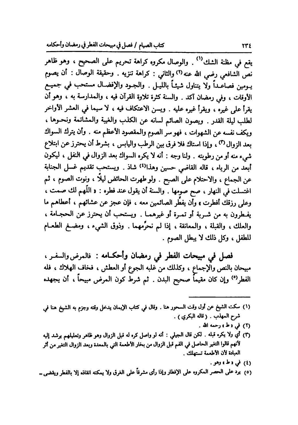 يقع في مظنة الشك. والوصال مكروه كراهة تحريم على الصحيح، وهو ظاهر نص الشافعي رحمه الله، والثاني: كراهة تنزيه. وحقيقة الوصال: أن يصوم يومين فصاعدا ولا يتناول شيئا بالليل. والجود والافضال مستحب في جميع الاوقات، وفي رمضان آكد. والسنة كثرة تلاوة القرآن فيه، والمدارسة به، وهو أن يقرأ على غيره، ويقرأ غيره عليه. ويسن الاعتكاف فيه، لا سيما في العشر الاواخر لطلب ليلة القدر. ويصون الصائم لسانه عن الكذب والغيبة والمشاتمة ونحوها، ويكف نفسه عن الشهوات، فهو سر الصوم والمقصود الاعظم منه. وأن يترك السواك بعد الزوال، وإذا استاك فلا فرق بين الرطب واليابس، بشرط أن يحترز عن ابتلاع شئ منه أو من رطوبته. ولنا وجه: أنه لا يكره السواك بعد الزوال في النفل، ليكون أبعد من الرياء، قاله القاضي حسين، وهو شاذ. ويستحب تقديم غسل الجنابة عن الجماع، والاحتلام على الصبح. ولو طهرت الحائض ليلا، ونوت الصوم، ثم اغتسلت في النهار، صح صومها. والسنة أن يقول عند فطره: اللهم لك صمت، وعلى رزقك أفطرت وأن يفطر الصائمين معه، فإن عجز عن عشائهم، أعطاهم ما يفطرون به من شربة أو تمرة أو غيرهما. ويستحب أن يحترز عن الحجامة، والعلك، والقبلة، والمعانقة، إذا لم نحرمهما. وذوق الشئ، ومضغ الطعام للطفل، وكل ذلك لا يبطل الصوم.