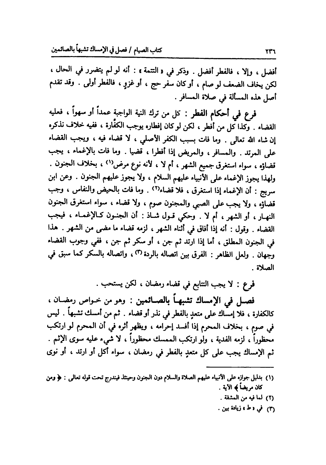 فصل في الامساك تشبها بالصائمين وهو من خواص رمضان، كالكفارة، فلا إمساك على متعد بالفطر في نذر أو قضاء. ثم من أمسك تشبها، ليس في صوم، بخلاف المحرم إذا أفسد إحرامه، ويظهر أثره في أن المحرم لو ارتكب محظورا، لزمه الفدية، ولو ارتكب الممسك محظورا، لا شئ عليه سوى الاثم. ثم الامساك يجب على كل متعد بالفطر في رمضان، سواء أكل أو ارتد، أو نوى