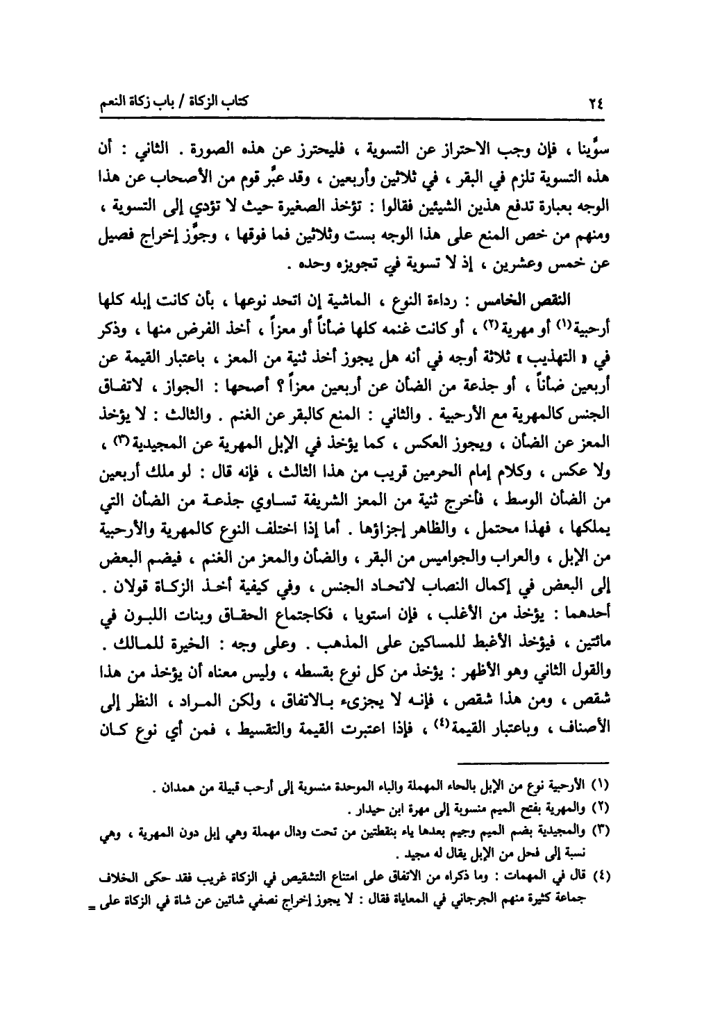 سوينا، فإن وجب الاحتراز عن التسوية، فليحترز عن هذه الصورة. الثاني: أن هذه التسوية تلزم في البقر، في ثلاثين وأربعين، وقد عبر قوم من الاصحاب عن هذا الوجه بعبارة تدفع هذين الشيئين فقالوا: تؤخذ الصغيرة حيث لا تؤدي إلى التسوية، ومنهم من خص المنع على هذا الوجه بست وثلاثين فما فوقها، وجوز إخراج فصيل عن خمس وعشرين، إذ لا تسوية في تجويزه وحده. النقص الخامس: رداءة النوع، الماشية إن اتحد نوعها، بأن كانت إبله كلها أرحبية أو مهرية، أو كانت غنمه كلها ضأنا أو معزا، أخذ الفرض منها، وذكر في التهذيب ثلاثة أوجه في أنه هل يجوز أخذ ثنية من المعز، باعتبار القيمة عن أربعين ضأنا، أو جذعة من الضأن عن أربعين معزا ؟ أصحها: الجواز، لاتفاق الجنس كالمهرية مع الارحبية. والثاني: المنع كالبقر عن الغنم. والثالث: لا يؤخذ المعز عن الضأن، ويجوز العكس، كما يؤخذ في الابل المهرية عن المجيدية، ولا عكس، وكلام إمام الحرمين قريب من هذا الثالث، فإنه قال: لو ملك أربعين من الضأن الوسط، فأخرج ثنية من المعز الشريفة تساوي جذعة من الضأن التي يملكها، فهذا محتمل، والظاهر إجزاؤها. أما إذا اختلف النوع كالمهرية والارحبيه من الابل، والعراب والجواميس من البقر، والضأن والمعز من الغنم، فيضم البعض إلى البعض في إكمال النصاب لاتحاد الجنس، وفي كيفية أخذ الزكاة قولان. أحدهما: يؤخذ من الاغلب، فإن استويا، فكاجتماع الحقاق وجنات اللبون في مائتين، فيؤخذ الاغبط للمساكين على المذهب. وعلى وجه: الخيرة للمالك. والقول الثاني وهو الاظهر: يؤخذ من كل نوع بقسطه، وليس معناه أن يؤخذ من هذا شقص، ومن هذا شقص، فانه لا يجزئ بالاتفاق، ولكن المراد، النظر إلى الاصناف، وباعتبار القيمة، فإذا اعتبرت القيمة والتقسيط، فمن أي نوع كان