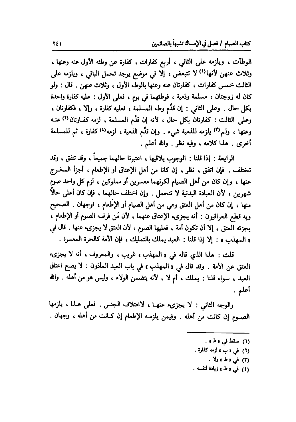 الوطآت، ويلزمه على الثاني، أربع كفارات، كفارة عن وطئه الاول عنه وعنها، وثلاث عنهن لا تتبعض، إلا في موضع يوجد تحمل الباقي، ويلزمه على الثالث خمس كفارات، كفارتان عنه وعنها بالوطئ الاول، وثلاث عنهن. قال: ولو كان له زوجتان، مسلمة وذمية، فوطئهما في يوم، فعلى الاول: عليه كفارة واحدة بكل حال. وعلى الثاني: إن قدم وطئ المسلمة، فعليه كفارة، وإلا، فكفارتان، وعلى الثالث: كفارتان بكل حال، لانه إن قدم المسلمة، لزمه كفارتان عنه وعنها، ولا يلزمه للذمية شئ. وإن قدم الذمية، لزمه لنفسه كفارة، ثم للمسلمة أخرى. هذا كلامه، وفيه نظر. والله أعلم. الرابعة: إذا قلنا: الوجوب يلاقيها، اعتبرنا حالهما جميعا، وقد تتفق، وقد تختلف. فإن اتفق، نظر، إن كانا من أهل الاعتاق أو الاطعام، أجزأ المخرج عنها، وإن كان من أهل الصيام لكونهما معسرين أو مملوكين، لزم كل واحد صوم شهرين، لان العبادة البدنية لاتتحمل. وإن اختلف حالهما، فإن كان أعلى حالا منها، نظر، إن كان من أهل العتق وهي من أهل الصيام أو الاطعام، فوجهان. الصحيح وبه قطع العراقيون: أنه يجزئ الاعتاق عنهما، لان من فرضه الصوم أو الاطعام، يجزئه العتق، إلا أن تكون أمة، فعليها الصوم، لان العتق لا يجزئ عنها. قال في المهذب: إلا إذا قلنا: العبد يملك بالتمليك، فإن الامة كالحرة المعسرة. قلت: هذا الذي قاله في المهذب غريب، والمعروف، أنه لا يجزئ العتق عن الامة. وقد قال في المهذب في باب العبد المأذون: لا يصح اعتاق العبد، سواء قلنا: يملك، أم لا، لانه يتضمن الولاء، وليس هو من أهله. والله أعلم. والوجه الثاني: لا يجزئ عنها، لاختلاف الجنس. فظلى هذا، يلزمها الصوم إن كانت من أهله. وفيمن يلزمه الاطعام إن كانت من أهله، وجهان.