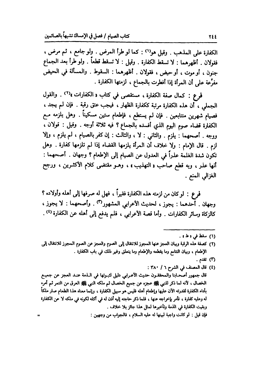 الكفارة على المذهب. وقيل: كما لو طرأ المرض. ولو جامع، ثم مرض، فقولان. أظهرهما: لا تسقط الكفارة. وقيل: لا تسقط قطعا. ولو طرأ بعد الجماع جنون، أو موت، أو حيض، فقولان. أظهرهما: السقوط. والمسألة في الحيض مفرعة على أن المرأة إذا أفطرت بالجماع، لزمتها الكفارة. فرع كمال صفة الكفارة، مستقصى في كتاب الكفارات. والقول الجملي، أن هذه الكفارة مرتبة ككفارة الظهار، فيجب عتق رقبة. فإن لم يجد، فصيام شهرين متتابعين. فإن لم يستطع، فإطعام ستين مسكينا. وهل يلزمه مع الكفارة قضاء صوم اليوم الذي أفسده بالجماع ؟ فيه ثلاثة أوجه. وقيل: قولان، ووجه. أصحهما: يلزم. والثاني: لا، والثالث: إن كفر بالصيام، لم يلزم، وإلا لزم. قال الامام: ولا خلاف أن المرأة يلزمها القضاء إذا لم تلزمها كفارة. وهل تكون شدة الغلمة عذرا في العدول عن الصيام إلى الاطعام ؟ وجهان. أصحهما: أنها عذر، وبه قطع صاحب التهذيب، وهو مقتضى كلام الاكثرين، ورجح الغزالي المنع. فرع لو كان من لزمته هذه الكفارة فقيرا، فهل له صرفها إلى أهله وأولاده ؟ وجهان. أحدهما: يجوز، لحديث الاعرابي المشهور. وأصحهما: لا يجوز، كالزكاة وسائر الكفارات. وأما قصة الاعرابي، فلم يدفع إلى أهله عن الكفارة.