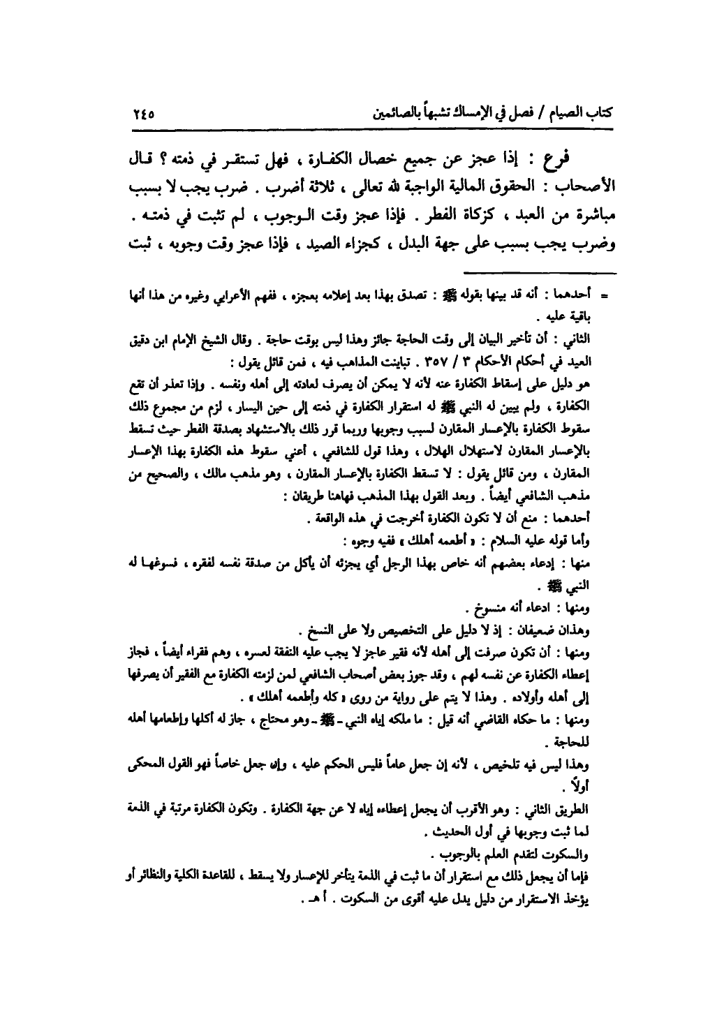 فرع إذا عجز عن جميع خصال الكفارة، فهل تستقر في ذمته ؟ قال الاصحاب: الحقوق المالية الواجبة لله تعالى، ثلاثة أضرب. ضرب يجب لا بسبب مباشرة من العبد، كزكاة الفطر. فإذا عجز وقت الوجوب، لم تثبت في ذمته. وضرب يجب بسبب على جهة البدل، كجزاء الصيد، فإذا عجز وقت وجوبه، ثبت