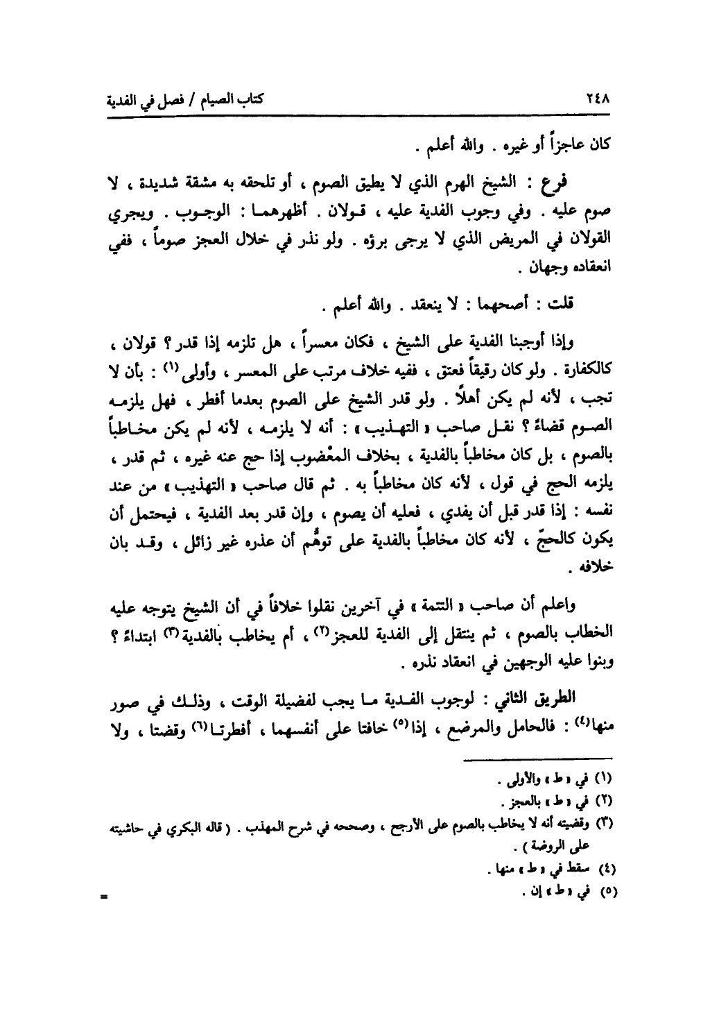 كان عاجزا أو غيره. والله أعلم. فرع الشيخ الهرم الذي لا يطيق الصوم، أو تلحقه به مشقة شديدة، لا صوم عليه. وفي وجوب الفدية عليه، قولان. أظهرهما: الوجوب. ويجري القولان في المريض الذي لا يرجى برؤه. ولو نذر في خلال العجز صوما، ففي انعقاده وجهان. قلت: أصحهما: لا ينعقد. والله أعلم. وإذا أوجبنا الفدية على الشيخ، فكان معسرا، هل تلزمه إذا قدر ؟ قولان، كالكفارة. ولو كان رقيقا فعتق، ففيه خلاف مرتب على المعسر، والاولى: بأن لا تجب، لانه لم يكن أهلا. ولو قدر الشيخ على الصوم بعدما أفطر، فهل يلزمه الصوم قضاء ؟ نقل صاحب التهذيب: أنه لا يلزمه، لانه لم يكن مخاطبا بالصوم، بل كان مخاطبا بالفدية، بخلاف المعضوب إذا حج عنه غيره، ثم قدر، يلزمه الحج في قول، لانه كان مخاطبا به. ثم قال صاحب التهذيب من عند نفسه: إذا قدر قبل أن يفدي، فعليه أن يصوم، وإن قدر بعد الفدية، فيحتمل أن يكون كالحج، لانه كان مخاطبا بالفدية على توهم أن عذره غير زائل، وقد بان خلافه. واعلم أن صاحب التتمة في آخرين نقلوا خلافا في أن الشيخ يتوجه عليه الخطاب بالصوم، ثم ينتقل إلى الفدية بالعجز، أم يخاطب بالفدية ابتداء ؟ وبنوا عليه الوجهين في انعقاد نذره. الطريق الثاني: لوجوب الفدية ما يجب لفضيلة الوقت، وذلك في صور. فالحامل والمرضع، إن خافتا على أنفسهما، أفطرتا وقضتا، ولا