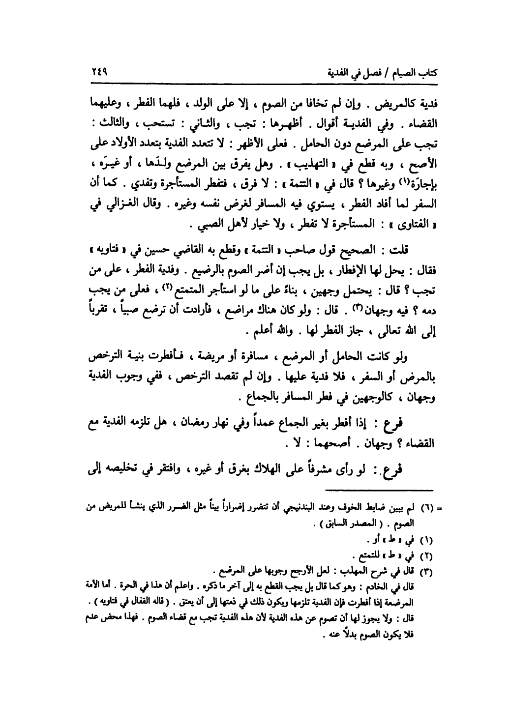فدية كالمريض. وإن لم تخافا من الصوم، إلا على الولد، فلهما الفطر وعليهما القضاء. وفي الفدية أقوال. أظهرها: تجب، والثاني: تستحب، والثالث: تجب على المرضع دون الحامل. فعلى الاظهر: لا تتعدد الفدية بتعدد الاولاد على الاصح، وبه قطع في التهذيب. وهل يفرق بين المرضع ولدها، أو غيره، بإجارة أو غيرها ؟ قال في التتمة: لا فرق، فتفطر المستأجرة وتفدي. كما أن السفر لما أفاد الفطر، يستوي فيه المسافر لغرض نفسه وغيره. وقال الغزالي في الفتاوى: المستأجرة لا تفطر، ولا خيار لاهل الصبي. قلت: الصحيح قول صاحب التتمة وقطع به القاضي حسين في فتاويه فقال: يحل لها الافطار، بل يجب إن أضر الصوم بالرضيع. وفدية الفطر، على من تجب ؟ قال: يحتمل وجهين، بناء على ما لو استأجر للتمتع، فعلى من يجب دمه ؟ فيه وجهان. قال: ولو كان هناك مراضع، فأرادت أن ترضع صبيا، تقربا إلى الله تعالى، جاز الفطر لها. والله أعلم. ولو كانت الحامل أو المرضع، مسافرة أو مريضة، فأفطرت بنية الترخص بالمرض أو السفر، فلا فدية عليها. وإن لم تقصد الترخص، ففي وجوب الفدية وجهان، كالوجهين في فطر المسافر بالجماع. فرع إذا أفطر بغير الجماع عمدا في نهار رمضان، هل تلزمه الفدية مع القضاء ؟ وجهان. أصحهما: لا. فرع لو رأى مشرفا على الهلاك بغرق أو غيره، وافتقر في تخليصه إلى