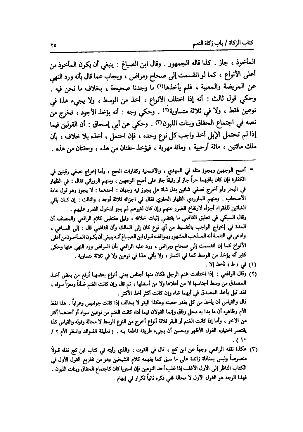 المأخوذ، جاز. كذا قاله الجمهور. وقال ابن الصباغ: ينبغي أن يكون المأخوذ من أعلى الانواع، كما لو انقسمت إلى صحاح ومراض، ويجاب عما قال بأنه ورد النهي عن المريضة والمعيبة، فلم نأخذ إلا ما وجدنا صحيحة، بخلاف ما نحن فيه. وحكي قول ثالث: أنه إذا اختلف الانواع، أخذ من الوسط، ولا يجئ هذا في نوعين فقط، ولا في ثلاثة متساوية. وحكي وجه: أنه يؤخذ الاجود، فخرج من نصه في اجتماع الحقاق وبنات اللبون. وحكي عن أبي إسحق: أن القولين فيما إذا لم تحتمل الابل أخذ واجب كل نوع وحده، فإن احتمل، أخذ بلا خلاف، بأن ملك مائتين، مائة أرحبية، ومائة مهرية، فيؤخذ حقتان من هذه، وحقتان من هذه.