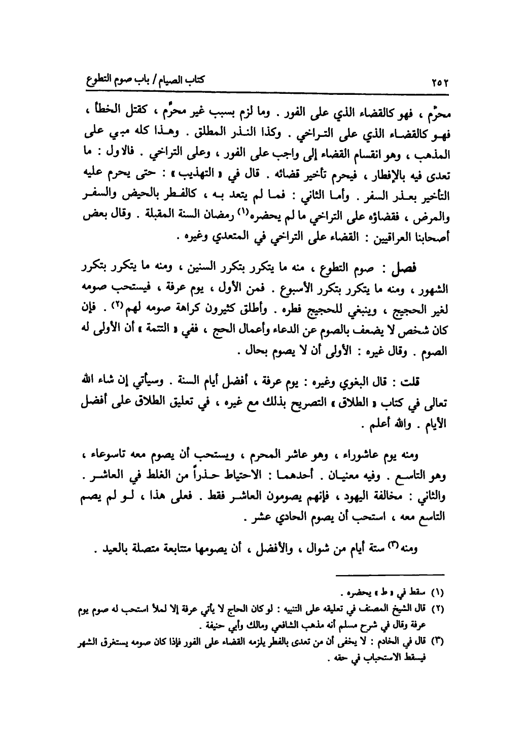 محرم، فهو كالقضاء الذي على الفور. وما لزم بسبب غير محرم، كقتل الخطأ، فهو كالقضاء الذي على التراخي. وكذا النذر المطلق. وهذا كله مبني على المذهب، وهو انقسام القضاء إلى واجب على الفور، وعلى التراخي. فالاول: ما تعدى فيه بالافطار، فيحرم تأخير قضائه. قال في التهذيب: حتى يحرم عليه التأخير بعذر السفر. وأما الثاني: فما لم يتعد به، كالفطر بالحيض والسفر والمرض، فقضاؤه على التراخي ما لم يحضر رمضان السنة المقبلة. وقال بعض أصحابنا العراقيين: القضاء على التراخي في المتعدي وغيره. فصل صوم التطوع، منه ما يتكرر بتكرر السنين، ومنه ما يتكرر بتكرر الشهور، ومنه ما يتكرر بتكرر الاسبوع. فمن الاول، يوم عرفة، فيستحب صومه لغير الحجيج، وينبغي للحجيج فطره. وأطلق كثيرون كراهة صومه لهم. فإن كان شخص لا يضعف بالصوم عن الدعاء وأعمال الحج، ففي التتمة أن الاولى له الصوم. وقال غيره: الاولى أن لا يصوم بحال. قلت: قال البغوي وغيره: يوم عرفة، أفضل أيام السنة. وسيأتي إن شاء الله تعالى في كتاب الطلاق التصريح بذلك مع غيره، في تعليق الطلاق على أفضل الايام. والله أعلم. ومنه يوم عاشوراء، وهو عاشر المحرم، ويستحب أن يصوم معه تاسوعاء، وهو التاسع. وفيه معنيان. أحدهما: الاحتياط حذرا من الغلط في العاشر. والثاني: مخالفة اليهود فإنهم يصومون العاشر فقط. فعلى هذا، لو لم يصم التاسع معه، استحب أن يصوم الحادي عشر. ومنه ستة أيام من شوال، والافضل، أن يصومها متتابعة متصلة بالعيد.